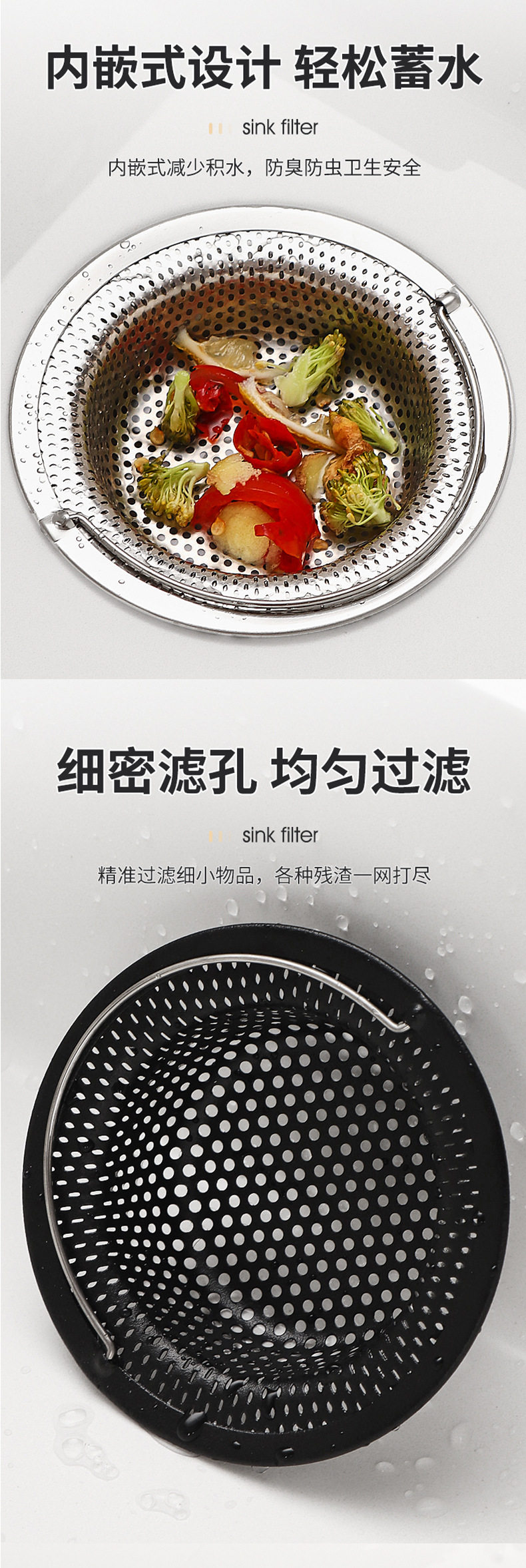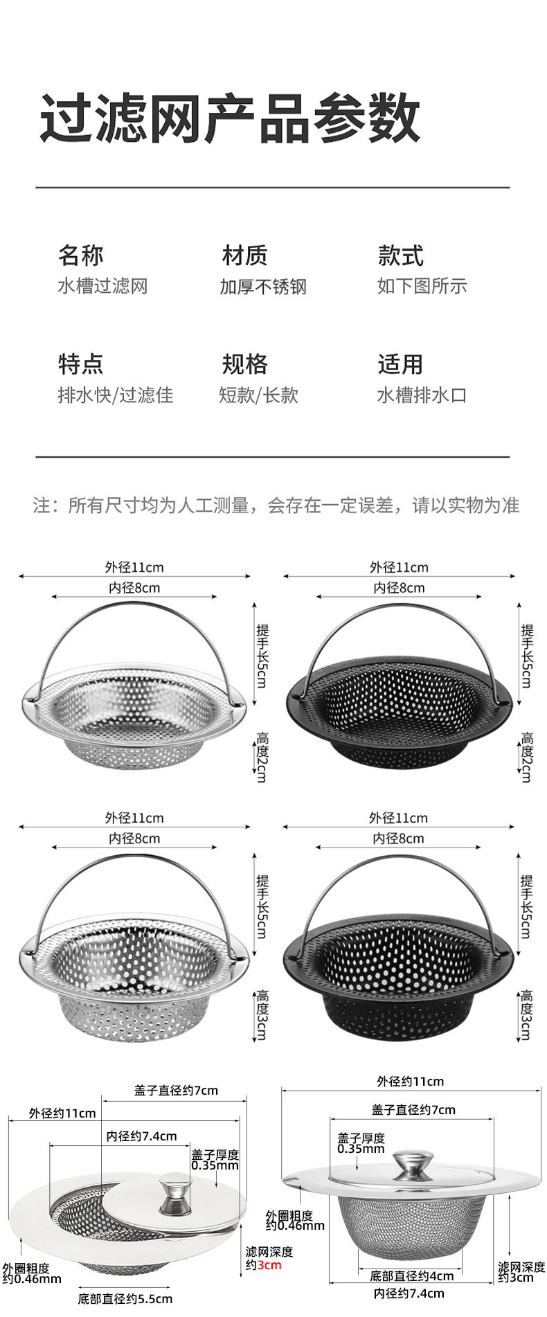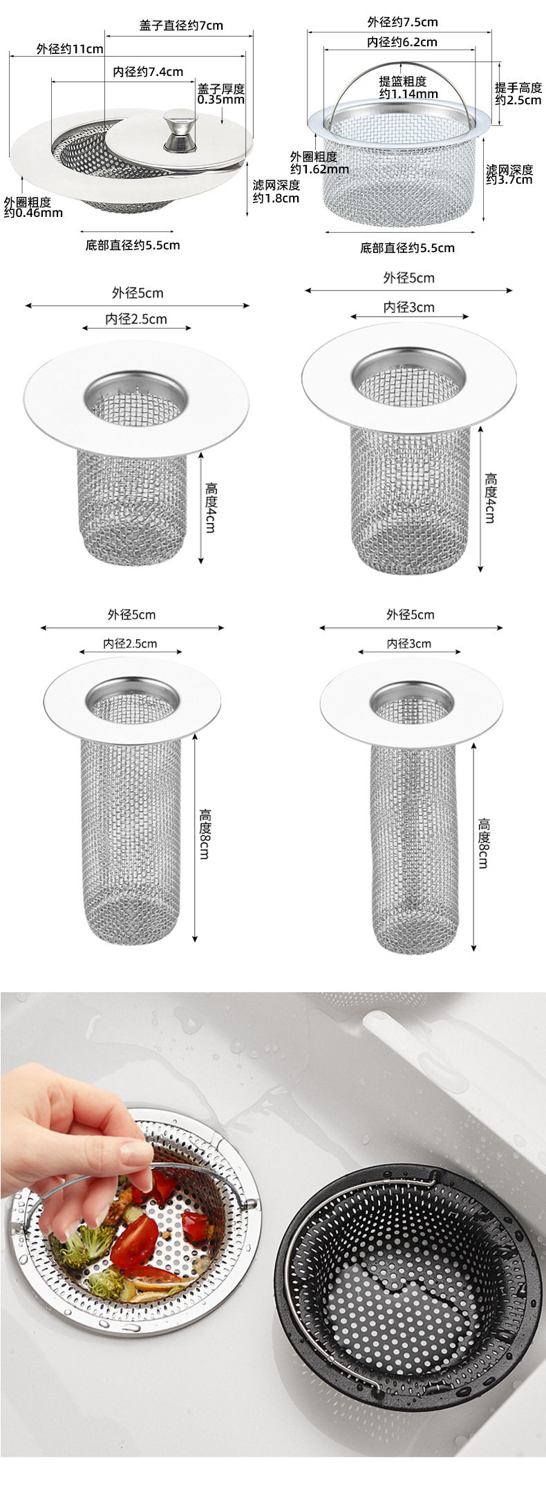 | Specifications | Sink strainer with lid (hard groove deep) silver,Sink strainer with cover (hard groove shallow) silver,Stainless steel sink strainer (hard groove) silver,Stainless steel sink strainer (hard groove) black,Stainless steel sink strainer (soft mesh groove),Full hole strainer with handle (hard groove shallow) silver,Full hole strainer with handle (hard groove deep) silver,Full hole strainer with handle (hard groove shallow) black,Full hole strainer with handle (hard groove deep) black,4cm strip filter cartridge 2.5cm diameter,4cm strip filter cartridge 3.5cm diameter,8cm strip filter cartridge 2.5cm diameter,8cm strip filter cartridge 3.5cm diameter,304 16cm filter residue with cover disc |