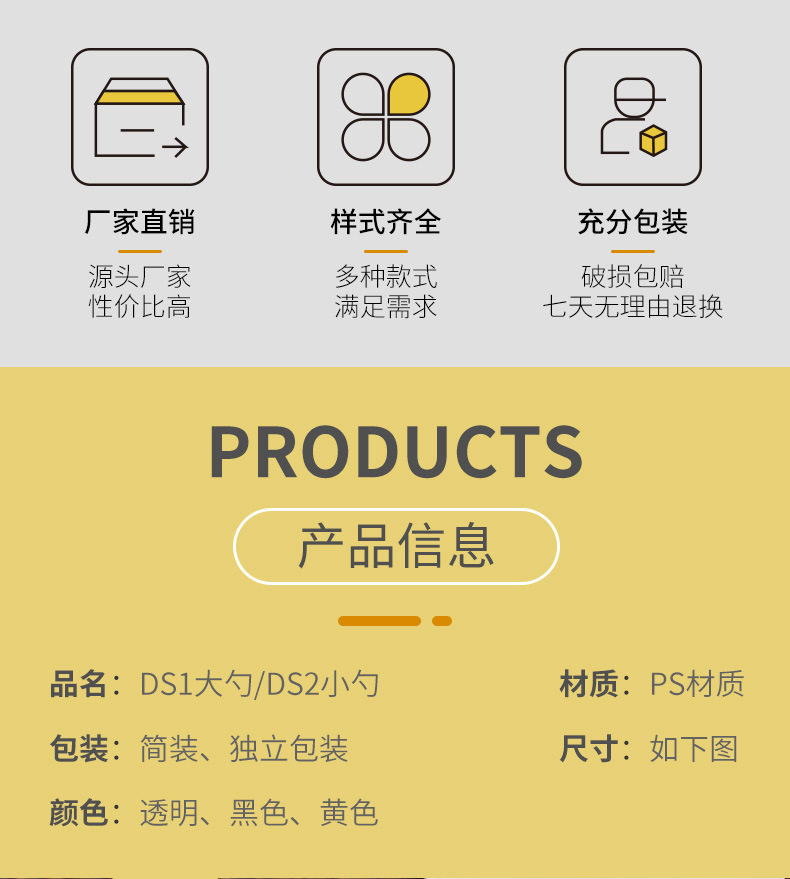 | Color | Ds1 yellow large spoon 15.0cm 0 simple pack,Ds1 black spoon 15.0cm 0 simple pack,Ds1 transparent large spoon 15.0cm 0 simple pack,Ds1 black spoon 15.0cm 0 pieces individually packed,Ds1 yellow large spoon 14 cm 100 pieces individually packed,Ds1 transparent large spoon 15.0cm 0 pieces individually packed,Ds2 yellow custard 12.0cm 0 simple packaging,Ds2 transparent custard 12.0cm 0 pieces simple packaging,Ds2 black custard 12.0cm 0 simple packaging,Ds2 transparent custard 100 pieces individually packed |