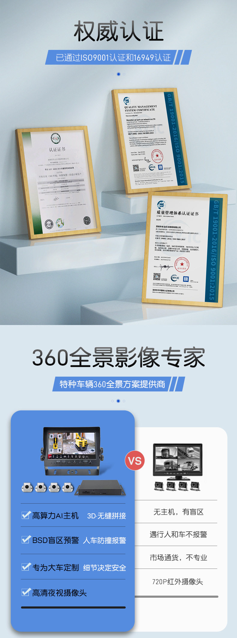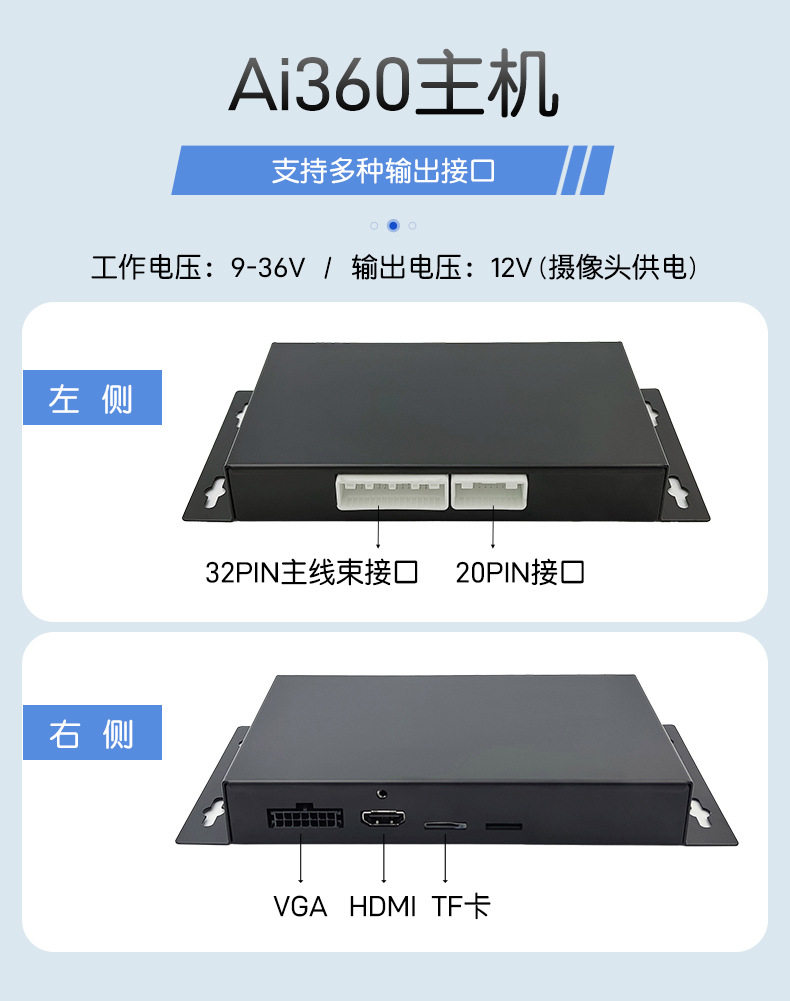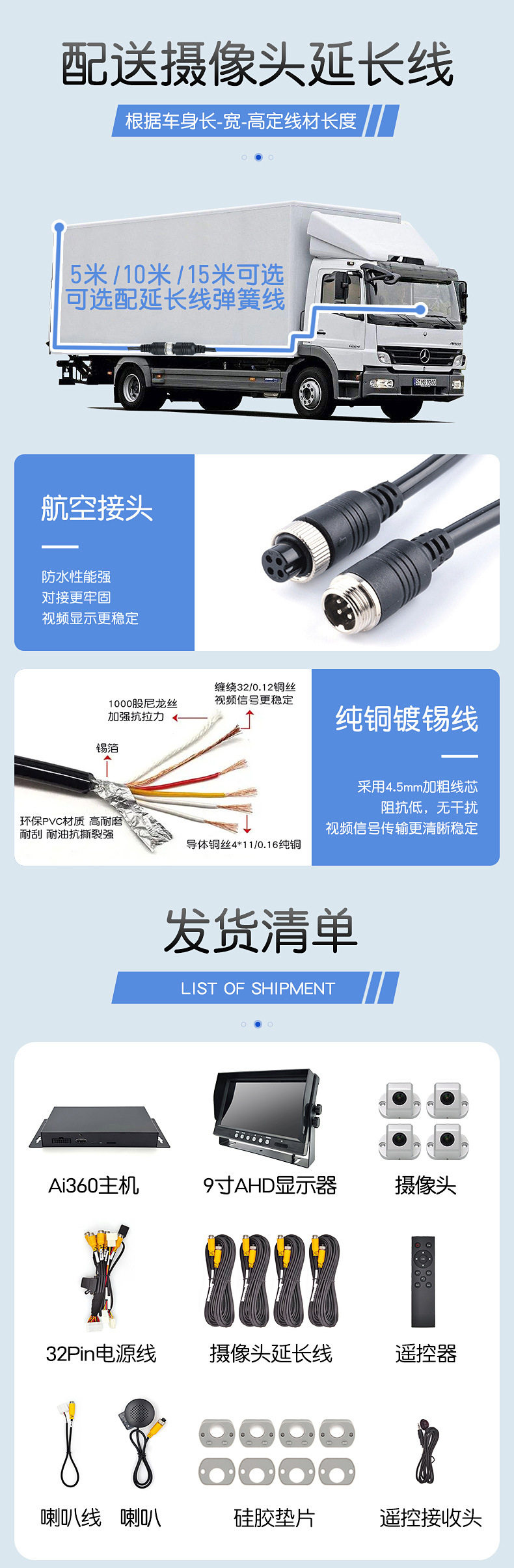 | Color classification | Special calibration debugging cloth for large vehicles,7inch ahd high brightness display,9inch ahd high brightness display,Sound and light alarm (domestic version),Sound and light alarm (international version),Sound and light alarm (guangdong version),360 host (without bsd) + 4 hd night vision cameras + 7inch monitors,360 host (without bsd) + 4 hd night vision cameras + 9inch monitors,Ai360 host (with bsd warning) + 4 hd night vision cameras + 7inch monitors,Ai360 host (with bsd warning) + 4 hd night vision cameras + 9inch monitors,Ai360 host (with bsd warning) + 6 hd night vision cameras + 7inch monitors,Ai360 host (with bsd warning) + 6 hd night vision cameras + 9inch monitors |
