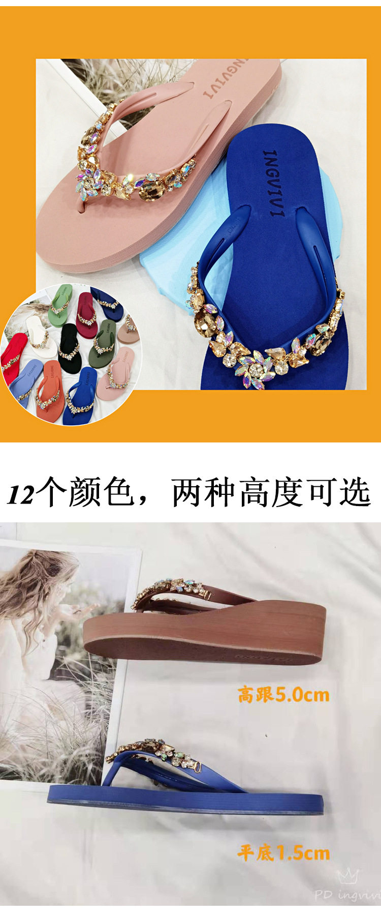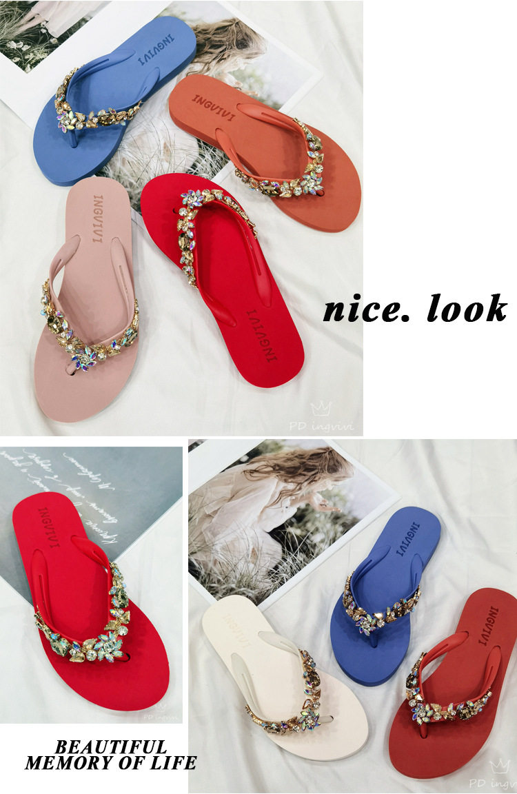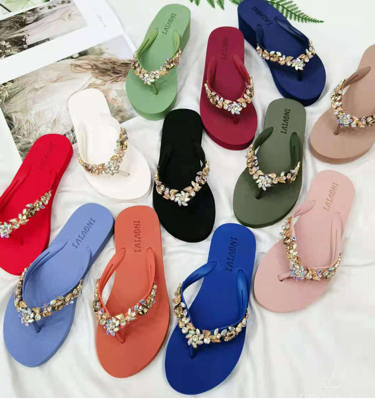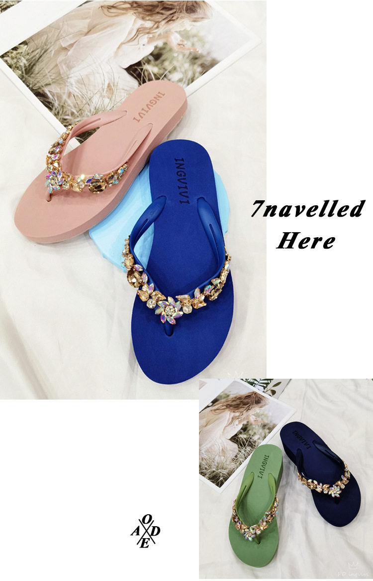 New Rhinestone Flip-Flops Women's Summer Flat Sandals and Slippers Rhinestone Chain Beach Slippers Wedge Heel Outer Wear Clip Slippers