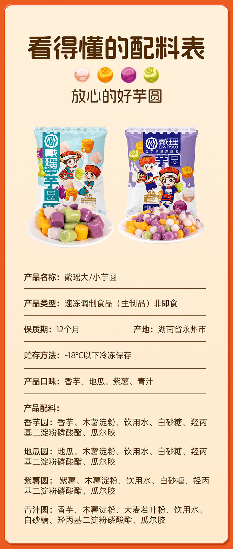 | Packaging specifications | Three-flavor Taro round,Four-flavor Taro round,Fragrant Taro round |