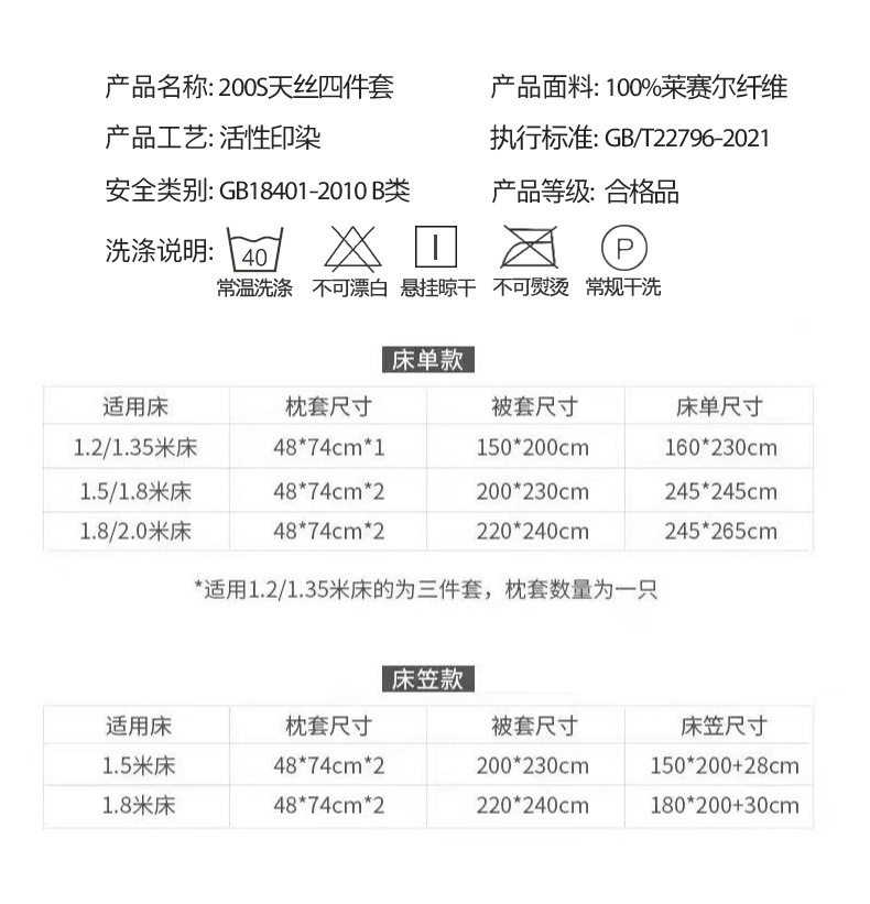 | Dimensions | 1.2m bed, bed sheet: quilt cover 150x 200cm, bed sheet 160x 230cm, pillowcase x2,1.5-1.8m bed, bed sheet: quilt cover 200x 230cm, bed sheet 245x 245cm, pillowcase x2,2.0m bed, bed sheet: quilt cover 220x 240cm, bed sheet 245x 265cm, pillowcase x2,1.2m bed, bed hat: quilt cover 150x 200cm, bed hat 120x 200cm, pillowcase x2,1.5m bed, bed hat: quilt cover 200x 230cm, bed hat 150x 200cm, pillowcase x2,1.8m bed, bed hat: quilt cover 200x 230cm, bed hat 180x 200cm, pillowcase x2 |