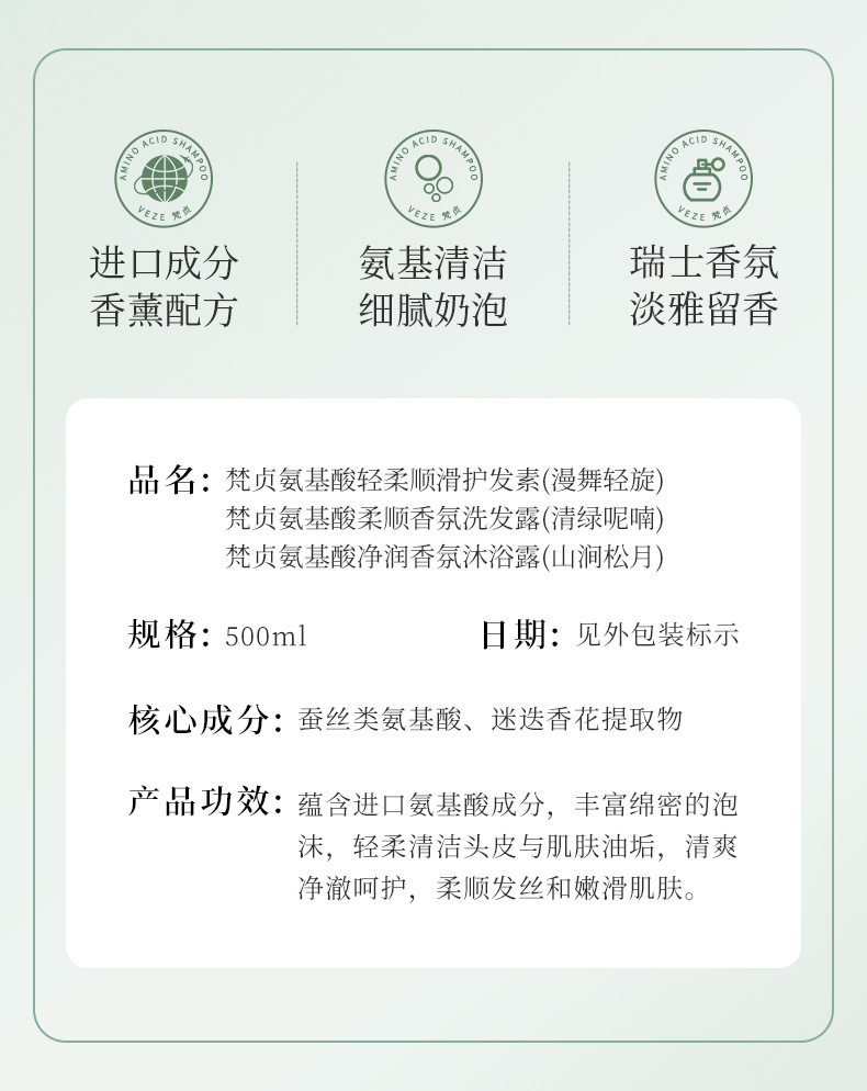 | color classification | VEZE Van Zhen Amino Acid Soft Fragrance Shampoo (Green Whisper) (New) 500ml,VEZE Van Zhen Amino Acid Clean Fragrance Body Soap (Mountain Stream Songyue) (New) 500ml |