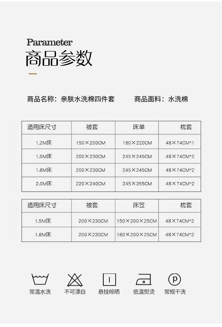| Dimensions | 1.2m sheets three-piece set "quilt cover 150x 200cm],1.5m sheets four-piece "quilt cover 200x 230cm],1.8m sheets four-piece set "quilt cover 200x 230cm],2.0m sheets four-piece "quilt cover 220x 240cm],1.5m bed hat four-piece set [quilt cover 200x 230cm]],1.8m bed hat four-piece set [quilt cover 200x 230cm]] |