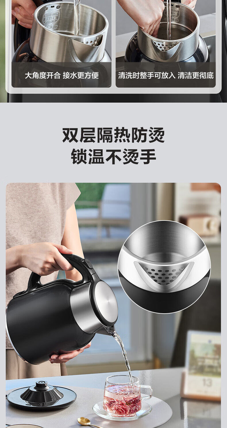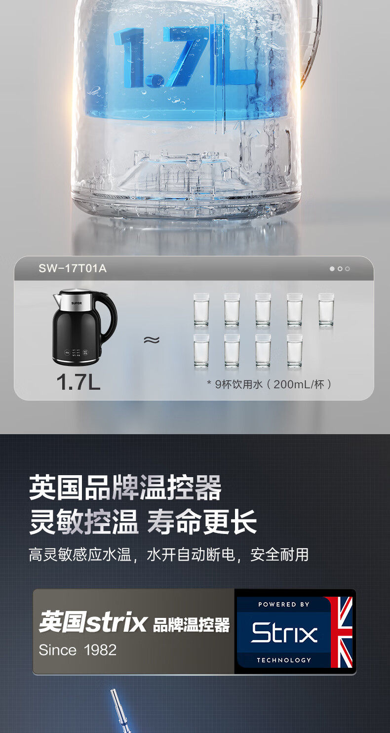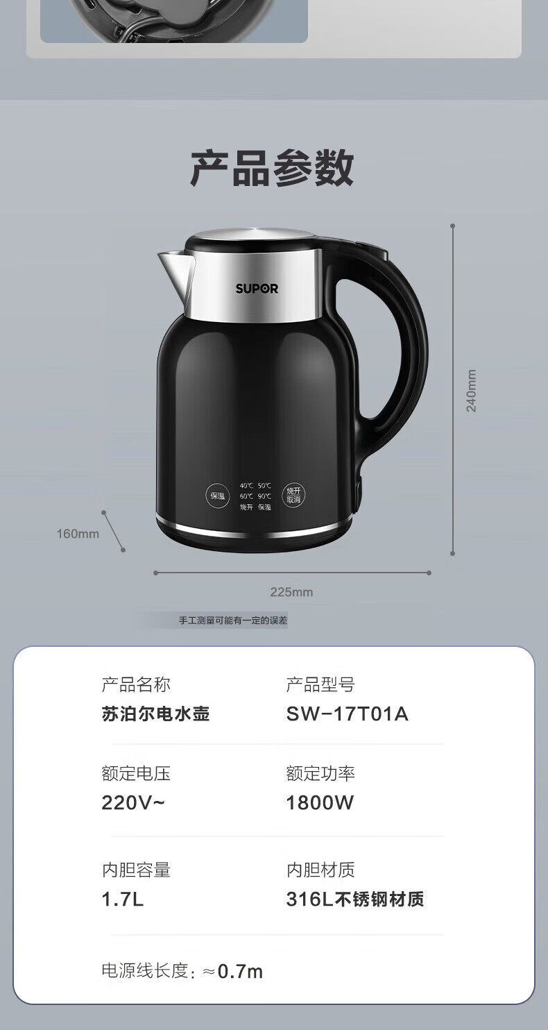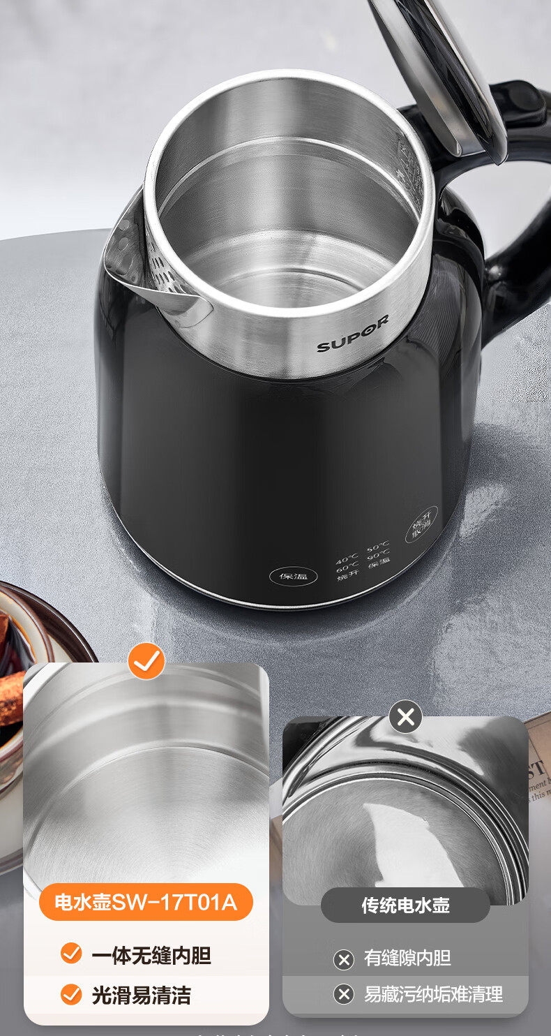 Supor Electric Kettle for Home Use, Insulated Kettle with Automatic Power-Off, 316 Stainless Steel Kettle Sw-17T01A