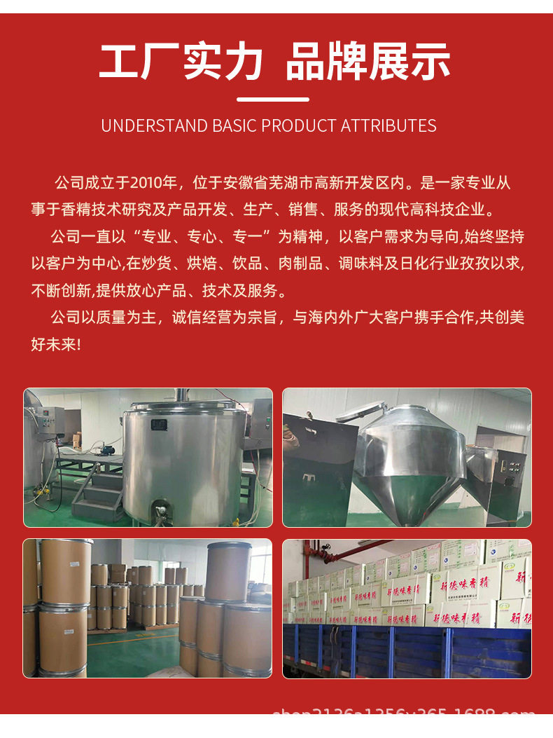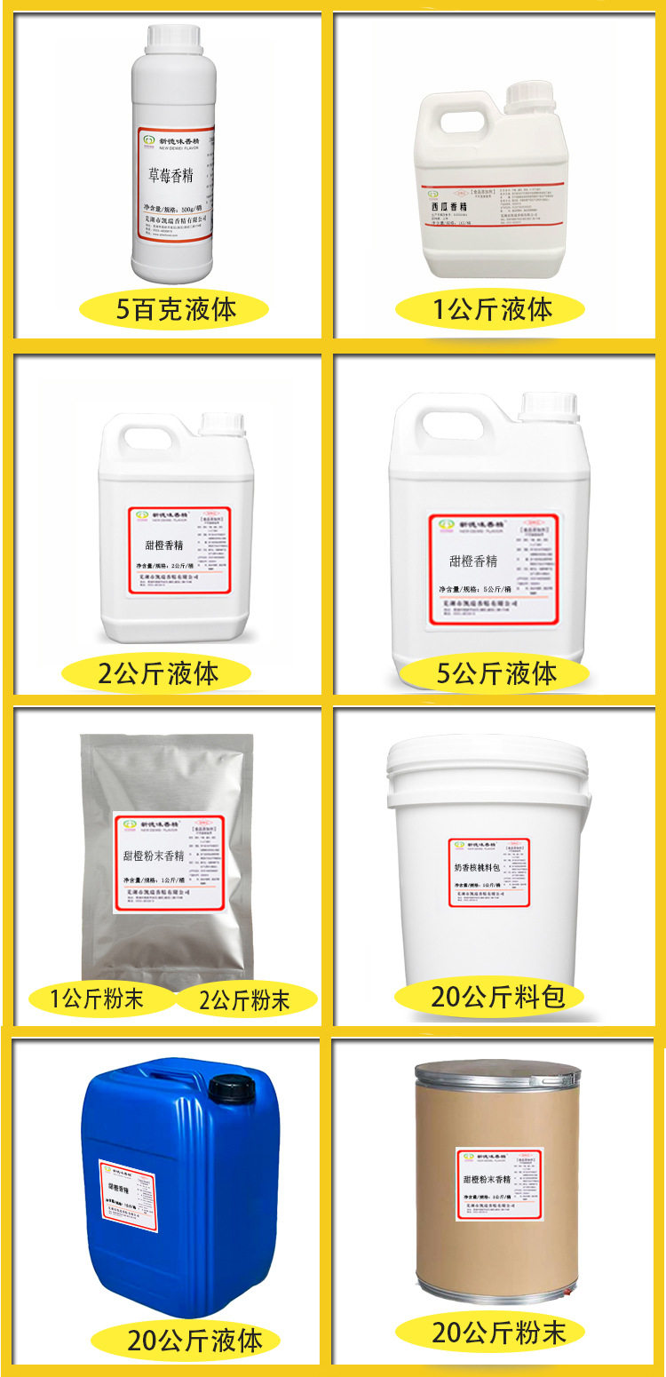 | Specification model | Jiaxiang fragrance* 1kg,Jiaxiang fragrance* 20kg,Fishy flavor* 1kg,Fishy flavor* 20kg,Fermental fragrance* 1kg,Fermental fragrance* 20kg,Chicken liver flavor* 1kg,Chicken liver flavor* 20kg,Shrimp flavor* 1kg,Shrimp flavor* 20kg,Snail flavor* 1kg,Snail flavor* 20kg,Fish appetizing essence* 1kg,Fish appetizing essence* 20kg,Qujiu essence* 1kg,Qujiu essence* 20kg,Musk essence* 1kg,Musk essence* 20kg,Durian flavor* 1kg,Durian flavor* 20kg,Milk fragrance* 1kg,Milk fragrance* 20kg,Wheat fragrance* 1kg,Wheat fragrance* 20kg,Barley sweet potato flavor* 1kg,Barley sweet potato flavor* 20kg,Red dates essence* 1kg,Red dates essence* 20kg,Clove fragrance* 1kg,Clove fragrance* 20kg,Osmanthus fragrance* 1kg,Osmanthus fragrance* 20kg,Roasted sweet potato flavor* 1kg,Roasted sweet potato flavor* 20kg,Fruit acid essence* 1kg,Fruit acid essence* 20kg,Lychee flavor* 1kg,Lychee flavor* 20kg,Fruit flavor* 1kg,Fruit flavor* 20kg,Strawberry flavor* 1kg,Strawberry flavor* 20kg,Old popsicle fragrance* 1kg,Old popsicle fragrance* 20kg,Pineapple flavor* 1kg,Pineapple flavor* 20kg,Banana essence* 1kg,Banana essence* 20kg,Green apple essence* 1kg,Green apple essence* 20kg,Hawthorn essence* 1kg,Hawthorn essence* 20kg,Traditional chinese medicine fragrance* 1kg,Traditional chinese medicine fragrance* 20kg,Round dream fragrance* 1kg,Round dream fragrance* 20kg,Brown sugar essence* 1kg,Brown sugar essence* 20kg,Brown sugar essence* 1kg,Brown sugar essence* 20kg,Caramel flavor* 1kg,Caramel flavor* 20kg,Peach flavor* 1kg,Peach flavor* 20kg,Honey flavor* 1kg,Honey flavor* 20kg,Cucumber fragrance* 1kg,Cucumber fragrance* 20kg,Milk and egg fragrance* 1kg,Milk and egg fragrance* 20kg,Sweet corn fragrance* 1kg,Sweet corn fragrance* 20kg,Blueberry essence* 1kg,Blueberry essence* 20kg,Coconut flavor* 1kg,Coconut flavor* 20kg,Grape flavors* 1kg,Grape flavors* 20kg,Peanut fragrance* 1kg,Peanut fragrance* 20kg,Sweet melon flavor* 1kg,Sweet melon flavor* 20kg,Baicao flavor* 1kg,Baicao flavor* 20kg,Watermelon essence* 1kg,Watermelon essence* 20kg,Chestnut flavor* 1kg,Chestnut flavor* 20kg,Purple potato essence* 1kg,Purple potato essence* 20kg,Taro essence* 1kg,Taro essence* 20kg,For other flavors, please contact this customer service* 1kg,For other flavors, please contact this customer service* 20kg |
