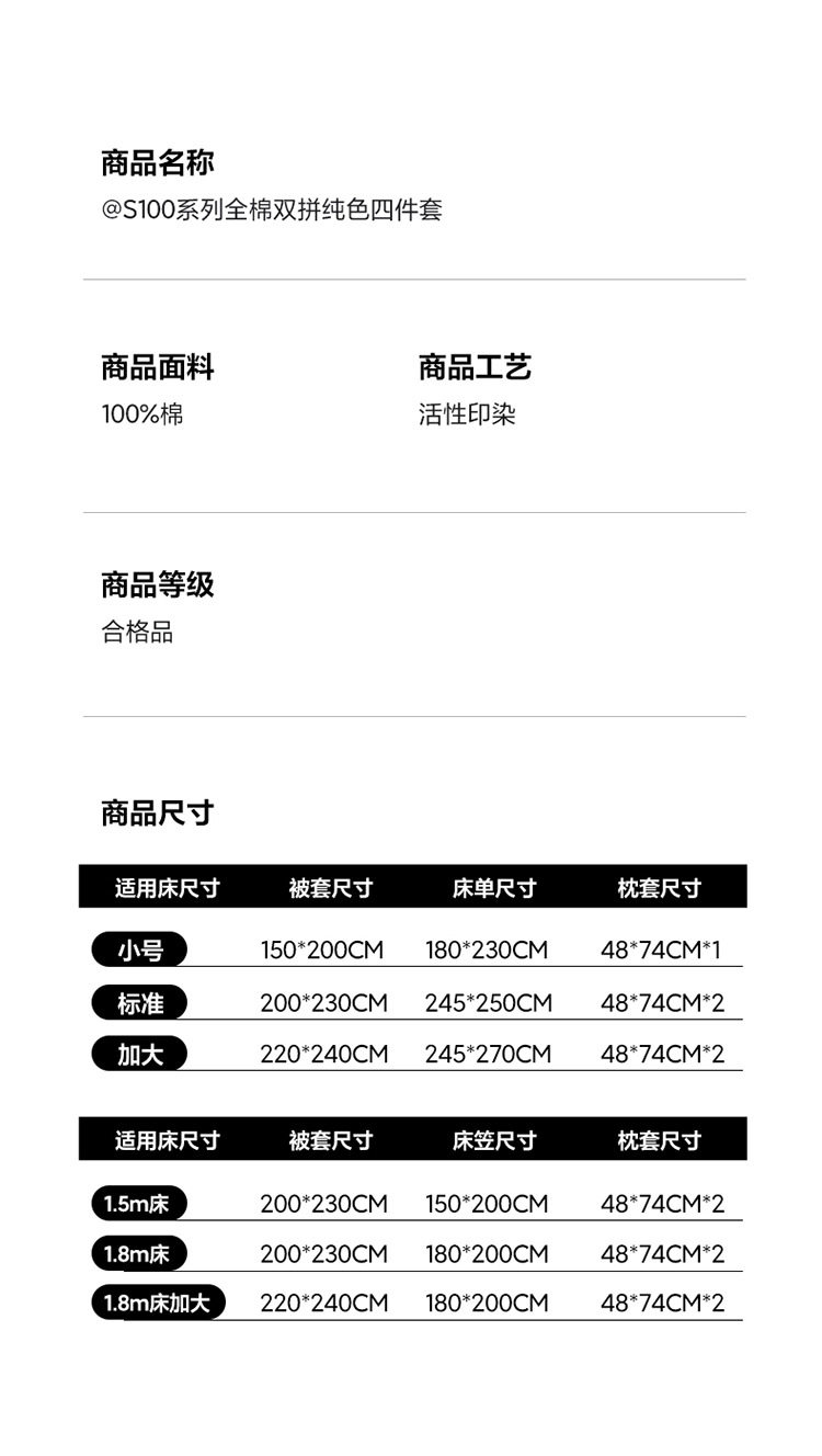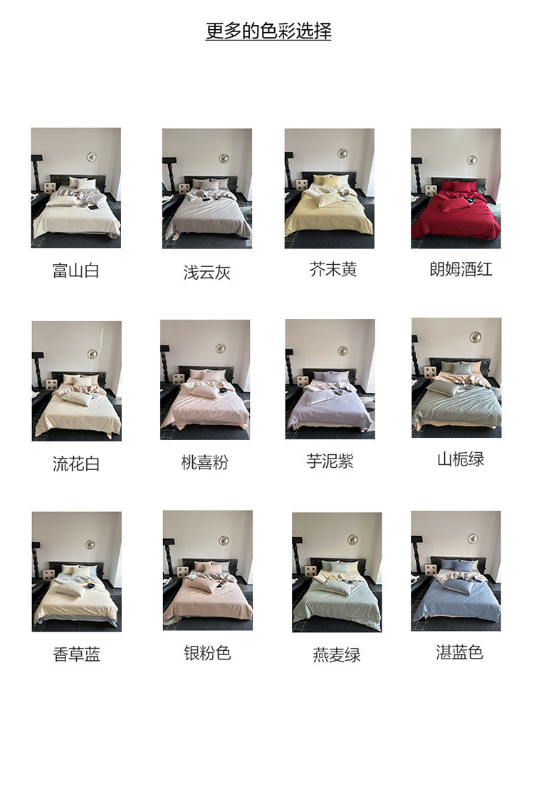 | Dimensions | 1.2m three-piece bed set (suitable for 150*200 quilt core) bed sheet style,1.5/1.8m bed four-piece set (suitable for 200*230 quilt core) bed sheet style,2.0m bed four-piece set (suitable for 220*240 quilt core) sheet style,1.5m bed four-piece set (fitted sheet) suitable for 200*230 quilt core,1.8m bed four-piece set (fitted sheet) suitable for 200*230 quilt core,1.8m bed-fitted sheet (quilt cover enlarged 220*240cm) |