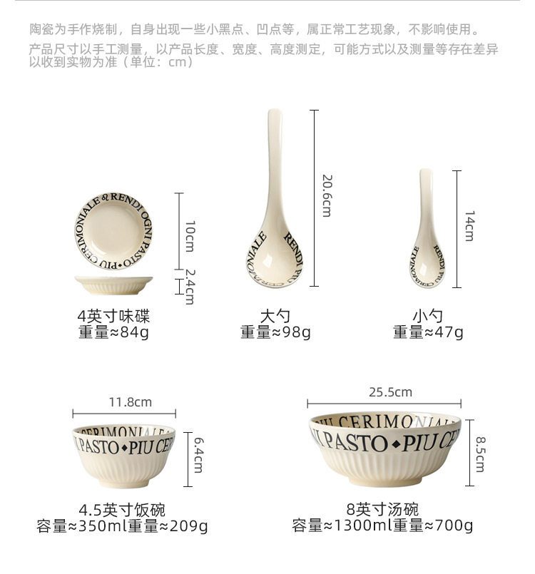 | Color | 4.5-inch Rice Bowl,8-inch soup bowl,8 inch flat disc,8-inch soup plate,10 "Flat Disc,12-inch fish plate,Large spoon,Small spoon,4-inch flavor dish |