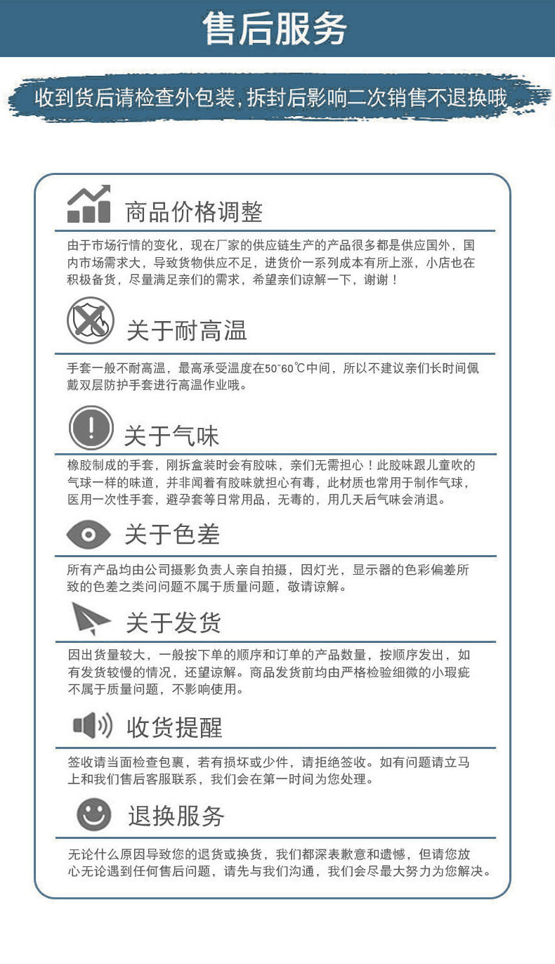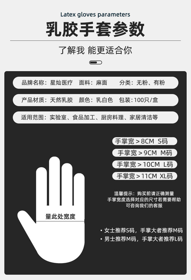 | Specification model | S powder-free latex gloves thickened 9-inch,M powder-free latex gloves thickened 9-inch,L powder-free latex gloves thickened 9-inch,XL powder-free latex gloves thickened 9-inch,S powder-free latex gloves lengthened 12 inches,M powder-free latex gloves lengthened 12 inches,L powder-free latex gloves lengthened 12 inches,XL powder-free latex gloves lengthened 12 inches |