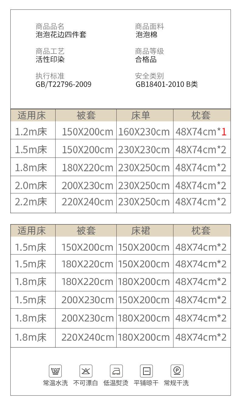 | Dimensions | Quilt cover 1.5*2.0 sheets 1.6*2.3 three-piece set,Quilt cover 1.5*2.0 sheets 2.3*2.3 four-piece set,Quilt cover 1.8*2.2 sheets 2.3*2.5 four-piece set,Quilt cover 2.0*2.3 sheets 2.3*2.5 four-piece set,Quilt cover 2.2*2.4 sheets 2.3*2.5 four-piece set,Quilt cover 1.5*2.0 bed skirt 1.5*2.0 four-piece set,Quilt cover 1.8*2.2 bed skirt 1.5*2.0 four-piece set,Quilt cover 1.8*2.2 bed skirt 1.8*2.0 four-piece set,Quilt cover 2.0*2.3 bed skirt 1.5*2.0 four-piece set,Quilt cover 2.0*2.3 bed skirt 1.8*2.0 four-piece set,Quilt cover 2.2*2.4 bed skirt 1.8*2.0 four-piece set |