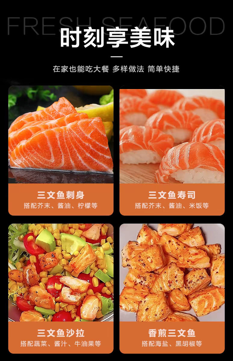 | Packaging specifications | Imported refined salmon 400g,Imported refined salmon 200g,Refined salmon 200g whole piece,Salmon skinless middle section 400g (whole piece),Salmon skinless middle section 2 boxes*400g (whole piece),Refined slices 1 box 380g,Refined slices 2 boxes*380g,Refined slices 3 boxes*380g,Half a piece, starting price is 5kg (for restaurants only), sold by the pound, no delivery if the price is low,Xinjiang whole salmon 2kg (assist in slicing and removing bones),Xinjiang whole salmon 3kg (assist in slicing and removing bones),All salmon without import are domestic |