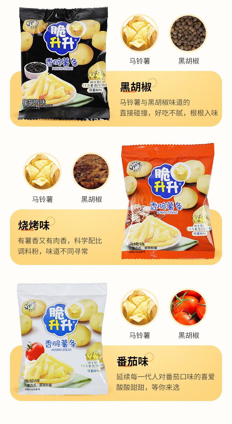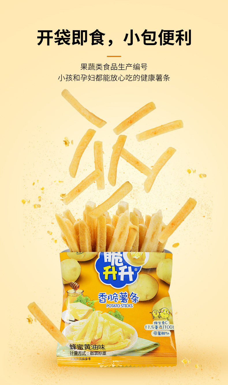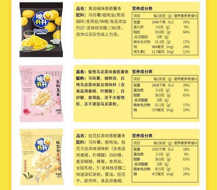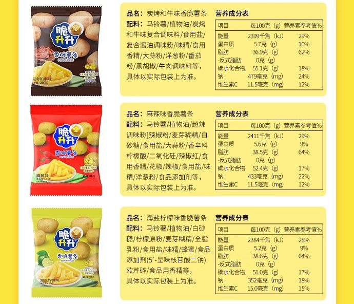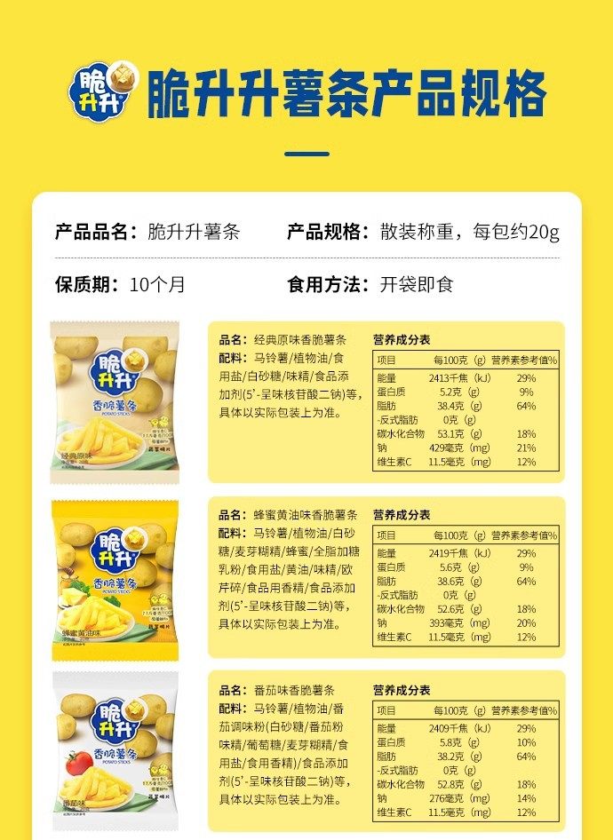 | Packaging specifications | 20g crispy fries honey butter flavor,Approximately 16g crispy rice crisps, honey butter flavor,20g classic original golden crispy french fries,20g crispy fries original flavor,16g crispy potato chips original flavor,20g crispy fries peach oolong tea flavor,20g smoked squid flavor,20g crispy fries tomato flavor,20g curry flavor,20g crispy fries lemon sea salt flavor,20g crispy french fries with osmanthus black tea flavor,20g classic crispy sweet potato chips,20g crispy fries spicy flavor,16g crispy rice crisps with beef flavor,16g crispy potato chips spicy flavor,16g crispy shengsheng potato chips tomato flavor,20g crispy fries black pepper flavor,20g crispy fries, charcoal grilled wagyu flavor,20g crispy potato chips with fragrant sichuan pepper flavor,New arrival: 20g crispy potato wedges - honey butter flavor,New product 20g crispy potato corners original flavor,New product 20g crispy potato corners charcoal grilled wagyu flavor,New arrival: 20g crispy potato dices - sea salt & maple flavored,16g sea salt lemon flavored potato chips,16g tomato flavored potato chips single pack,16g charcoal grilled squid flavored potato chips single pack,16g charcoal grilled shrimp flavored potato chips single pack,16g charcoal grilled wagyu beef flavored potato chips - single pack |