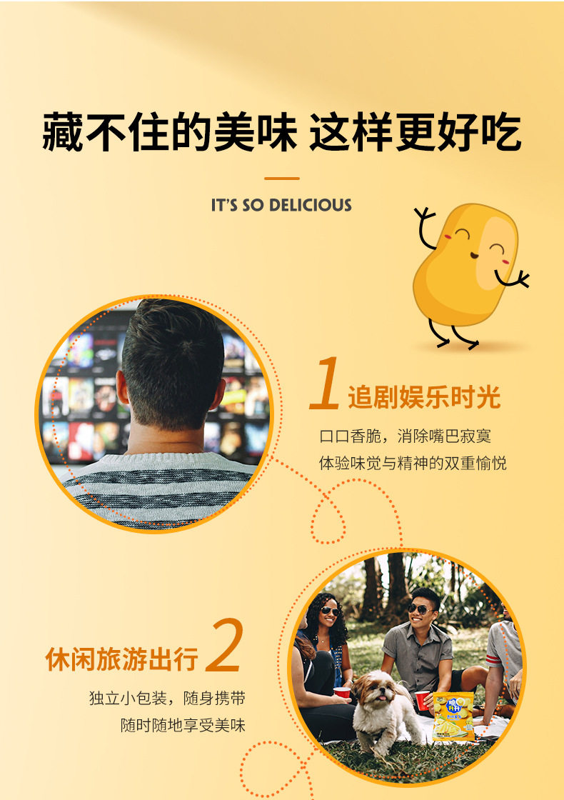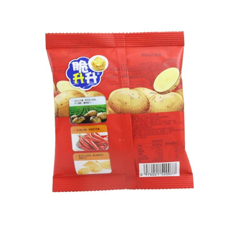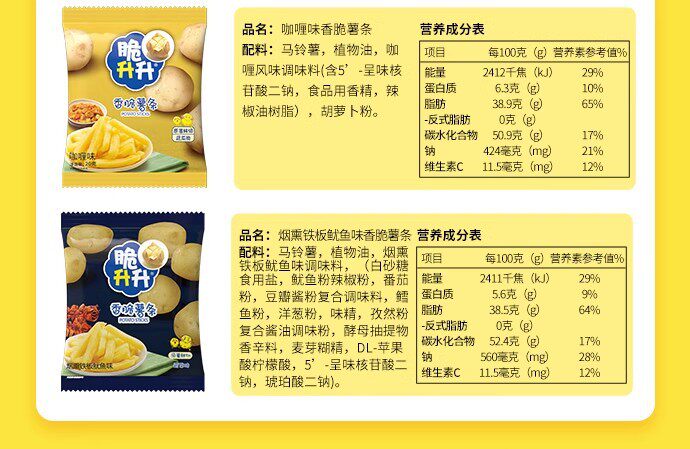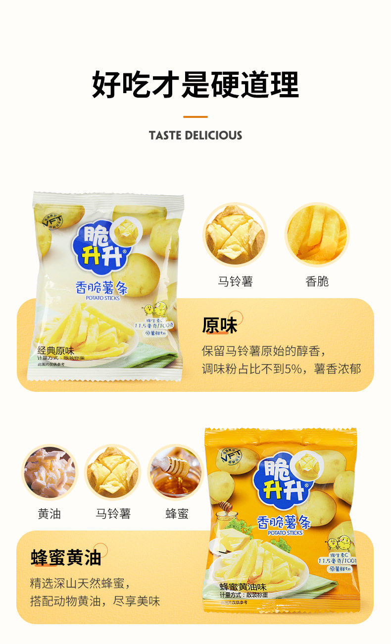 | Packaging specifications | 20g crispy fries honey butter flavor,Approximately 16g crispy rice crisps, honey butter flavor,20g classic original golden crispy french fries,20g crispy fries original flavor,16g crispy potato chips original flavor,20g crispy fries peach oolong tea flavor,20g smoked squid flavor,20g crispy fries tomato flavor,20g curry flavor,20g crispy fries lemon sea salt flavor,20g crispy french fries with osmanthus black tea flavor,20g classic crispy sweet potato chips,20g crispy fries spicy flavor,16g crispy rice crisps with beef flavor,16g crispy potato chips spicy flavor,16g crispy shengsheng potato chips tomato flavor,20g crispy fries black pepper flavor,20g crispy fries, charcoal grilled wagyu flavor,20g crispy potato chips with fragrant sichuan pepper flavor,New arrival: 20g crispy potato wedges - honey butter flavor,New product 20g crispy potato corners original flavor,New product 20g crispy potato corners charcoal grilled wagyu flavor,New arrival: 20g crispy potato dices - sea salt & maple flavored,16g sea salt lemon flavored potato chips,16g tomato flavored potato chips single pack,16g charcoal grilled squid flavored potato chips single pack,16g charcoal grilled shrimp flavored potato chips single pack,16g charcoal grilled wagyu beef flavored potato chips - single pack |