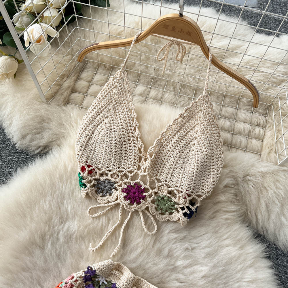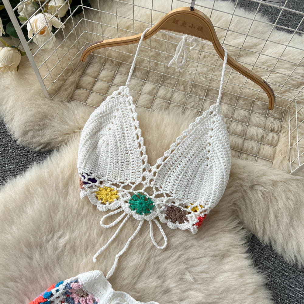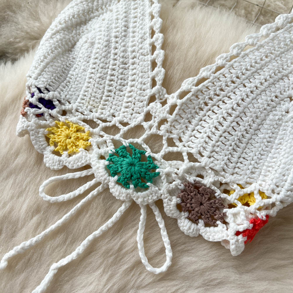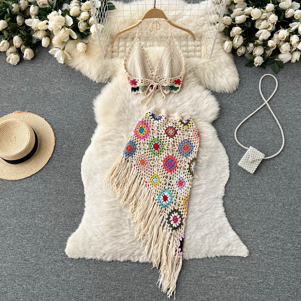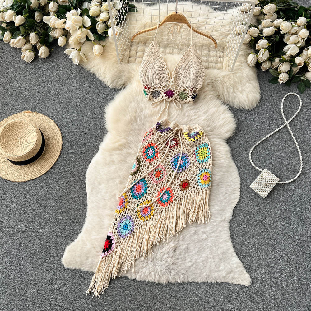Summer Bohemian Knitted Hollow Crochet Neck V-Neck Tube Top + Irregular Skirt Two-Piece Suit