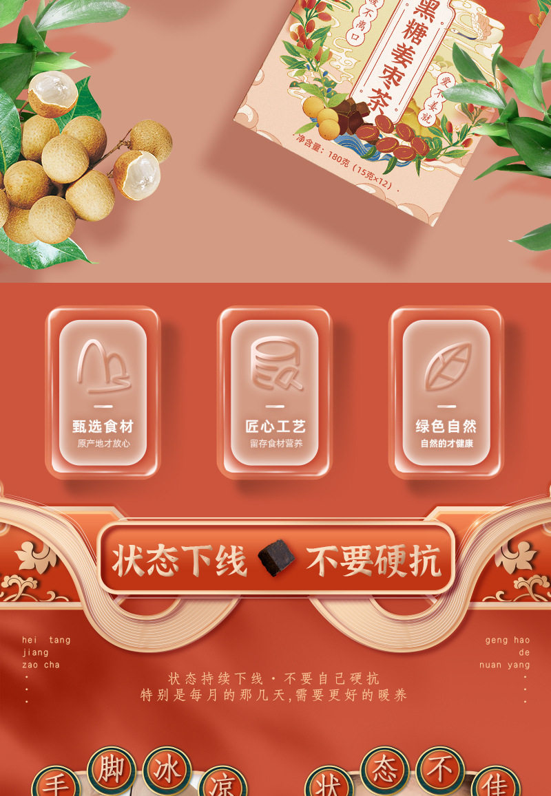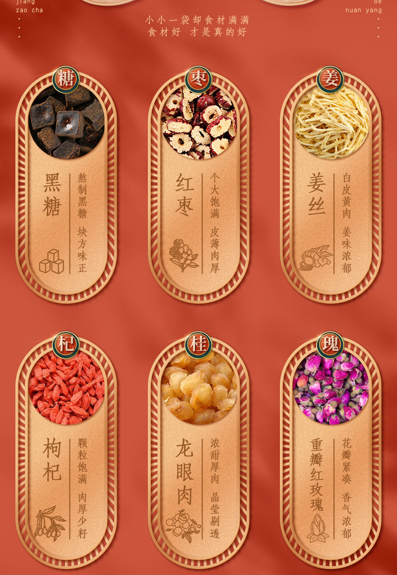 | Raw materials and ingredients | Brown sugar, red dates, shredded ginger, medlar, Dragon's Eye meat, double red rose |
