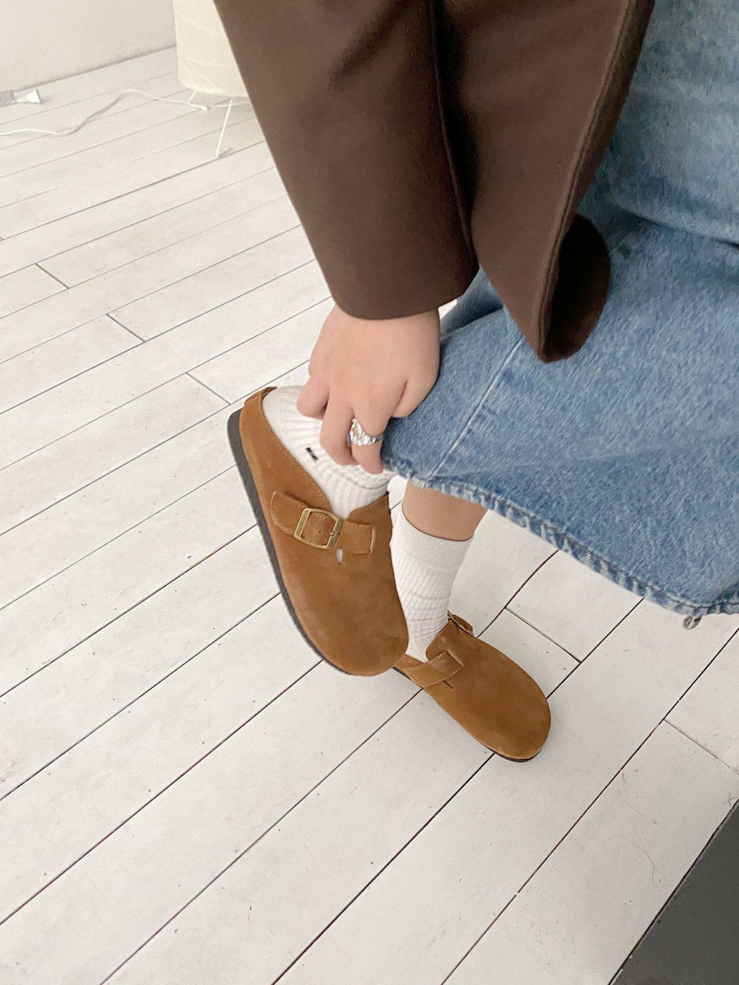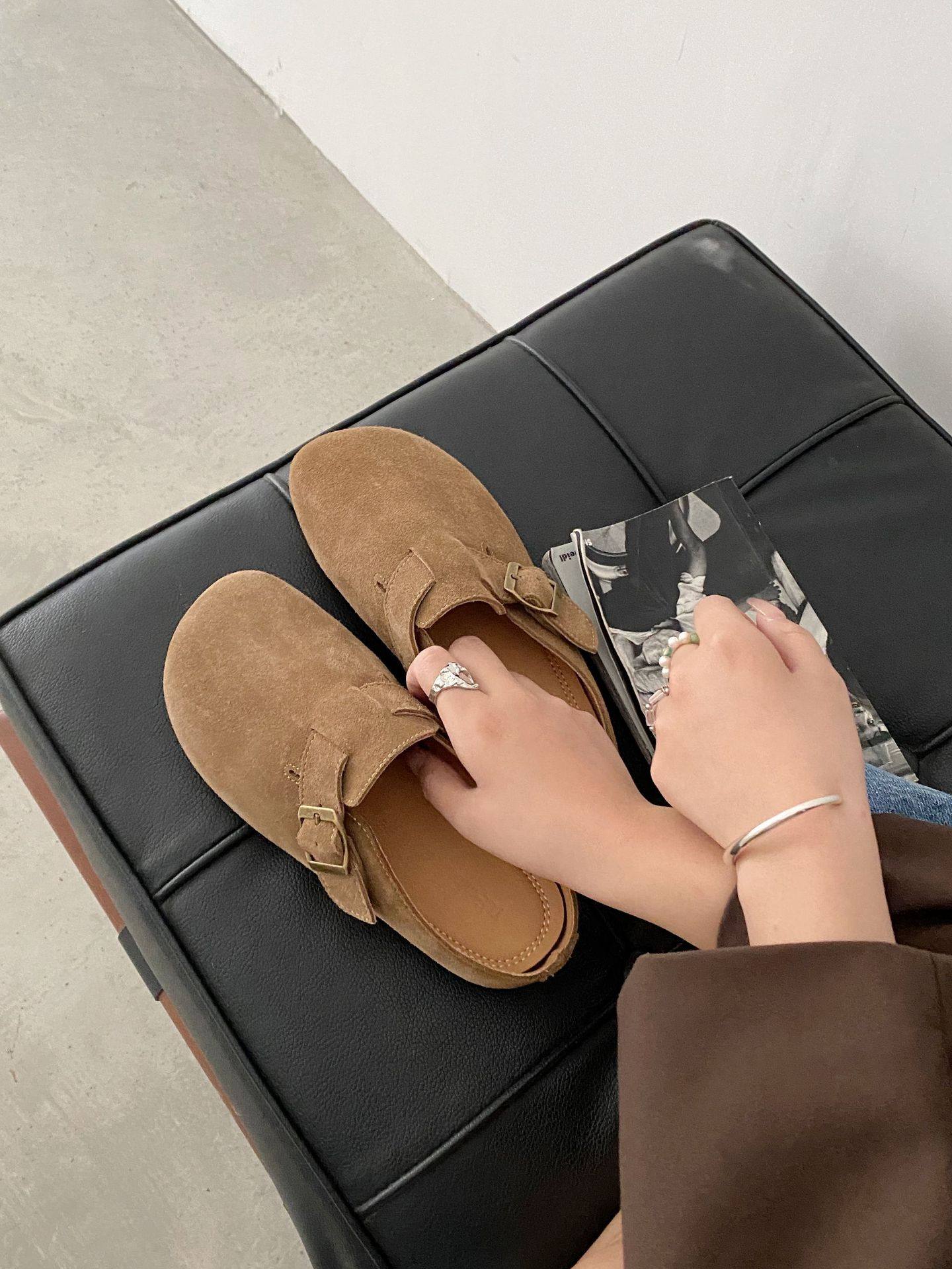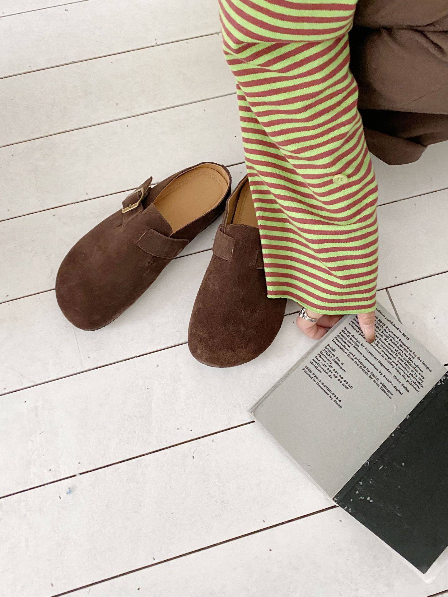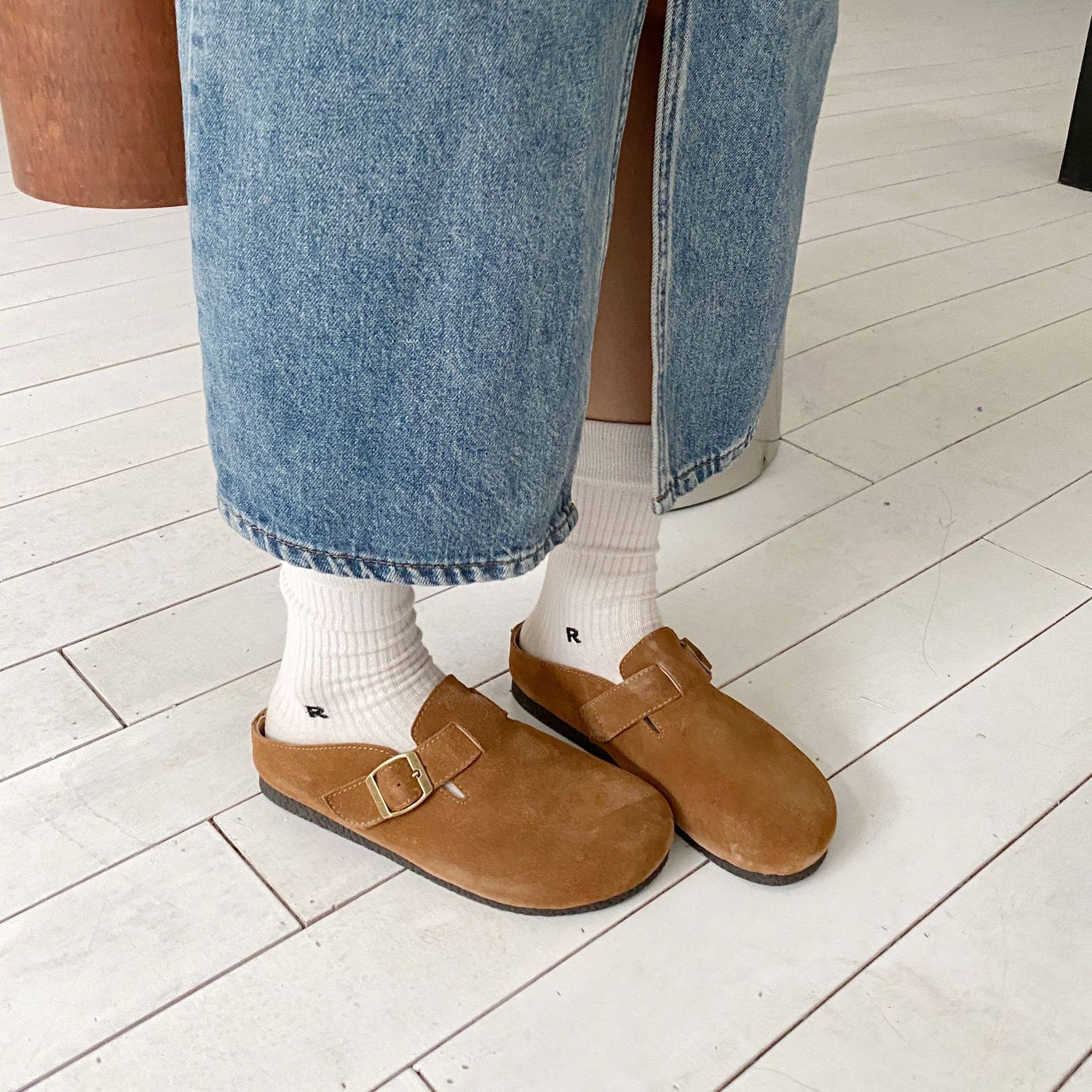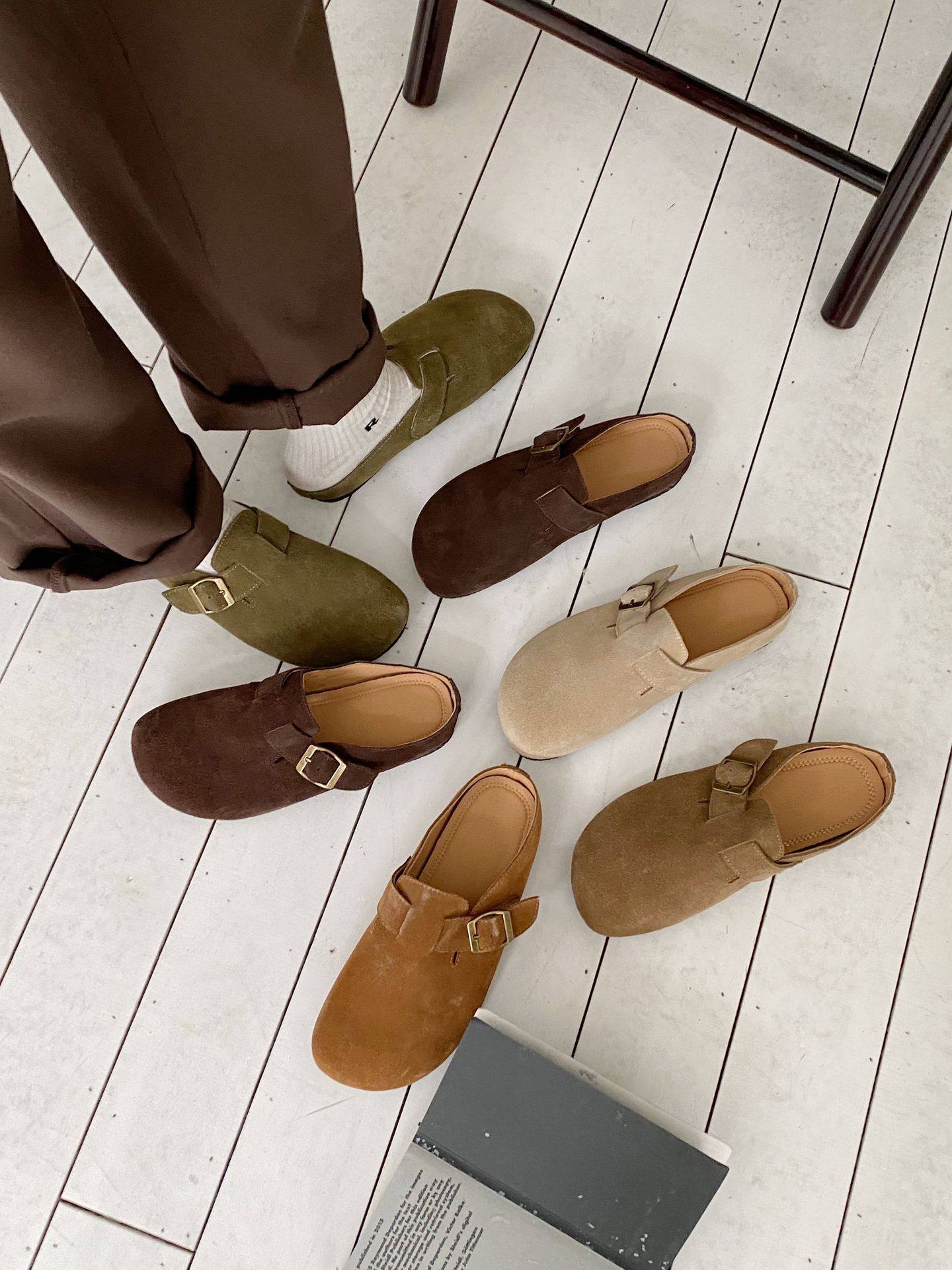 Genuine Leather Cow Suede Birkenstock Retro 2023 Autum New Flats Soft Sole Versatile One-Leg Toe Half Slippers