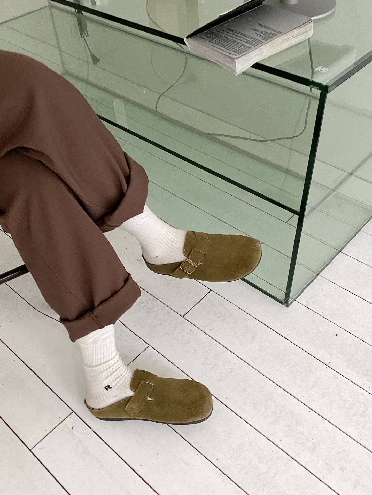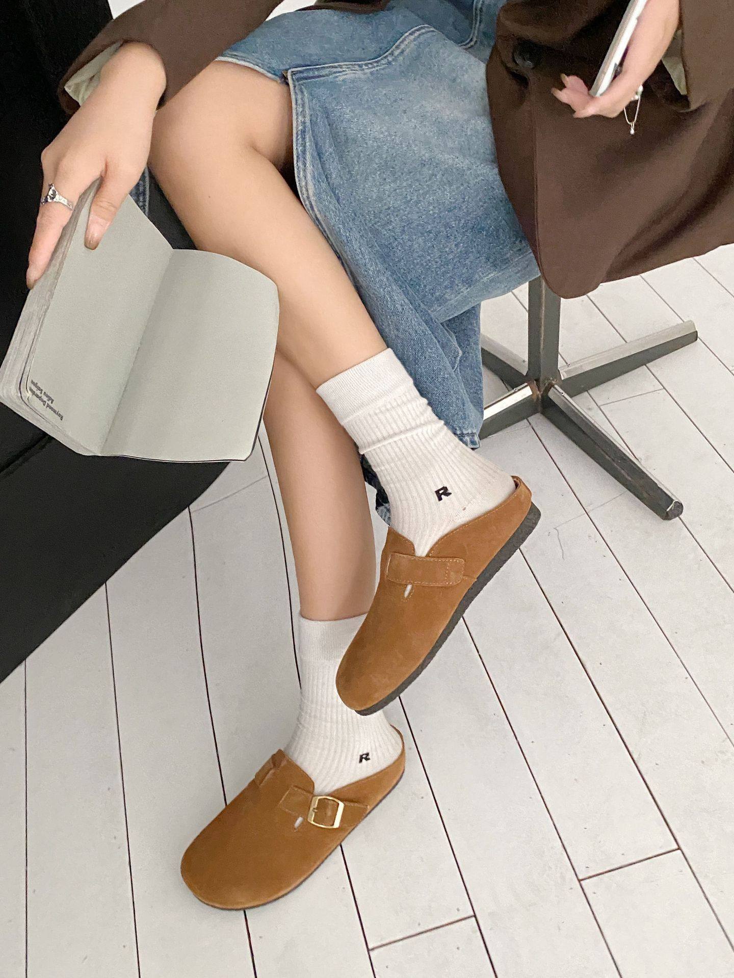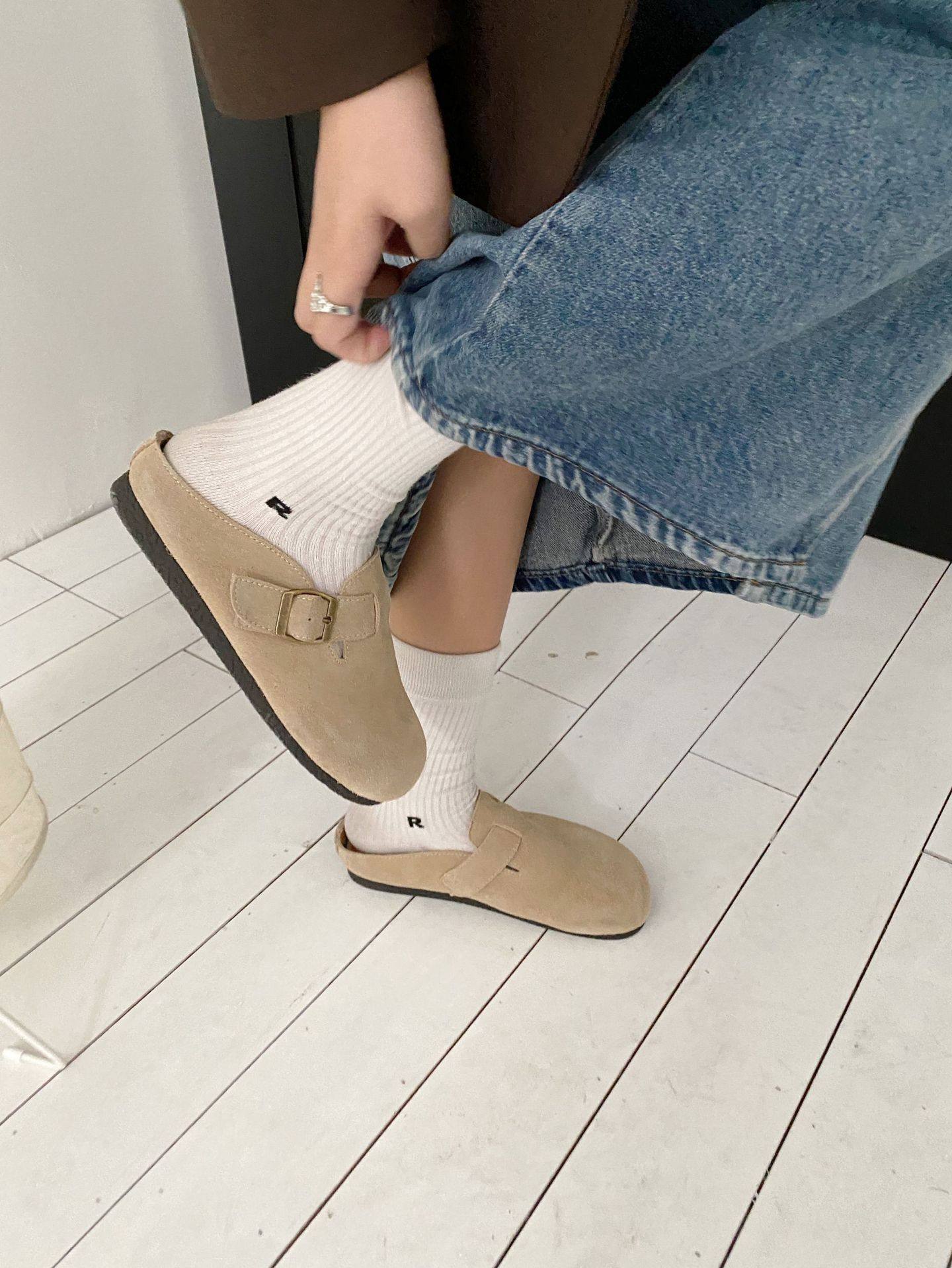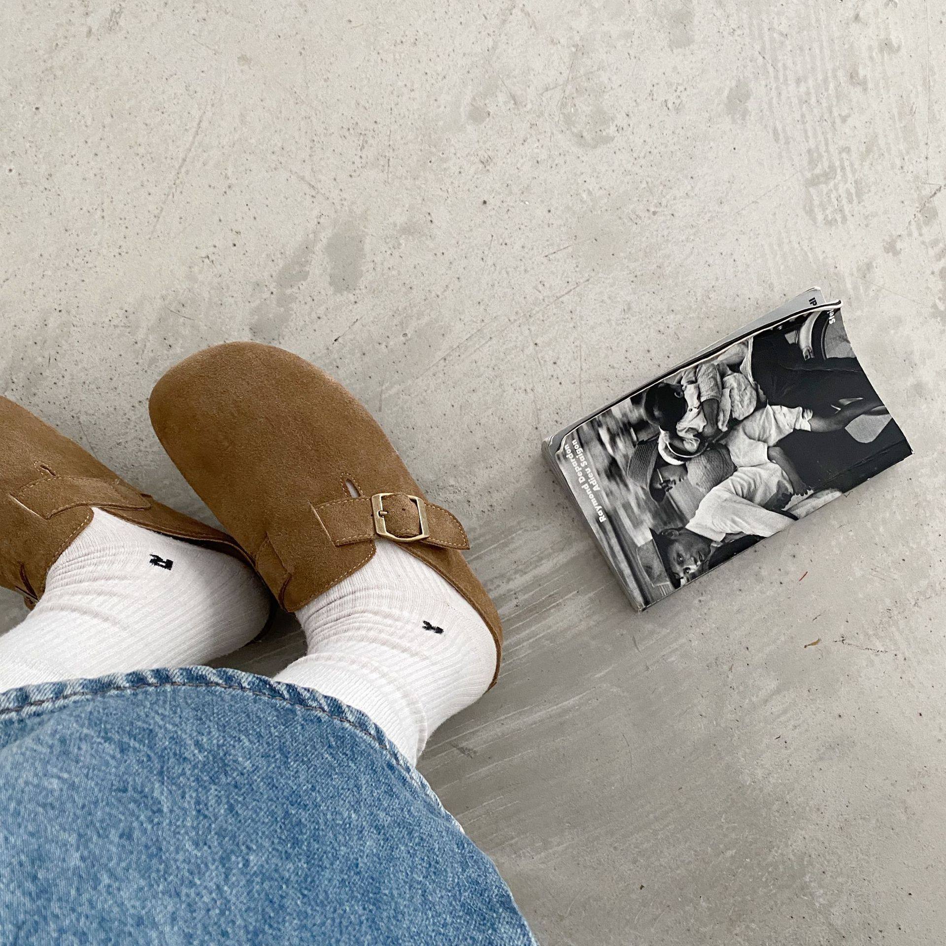 Genuine Leather Cow Suede Birkenstock Retro 2023 Autum New Flats Soft Sole Versatile One-Leg Toe Half Slippers