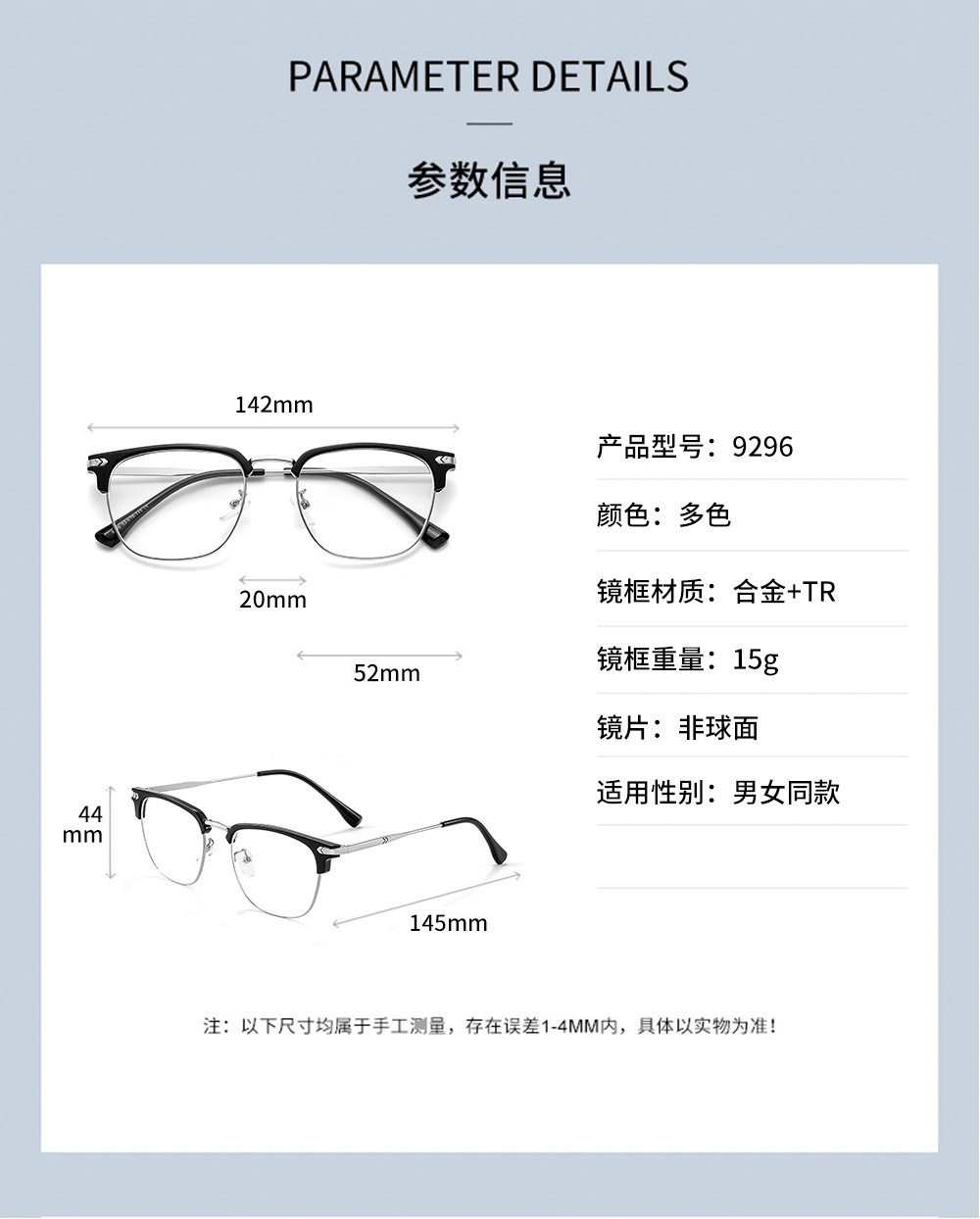| Frame color | Black silver 9296,Coconut gray 9296,Black gold 9296,Black gun color 9296,Black 9296,Black silver (pure titanium) 50199,Coconut gray (pure titanium) 50199,Black (pure titanium) 50199,Black gold (pure titanium) 50199,Black gun (pure titanium) 50199,Black silver (titanium alloy)122601,Black gun (titanium alloy)122601,Black gold (titanium alloy)122601,Black (titanium alloy)122601,Silver transparent gray (titanium alloy)122601 |