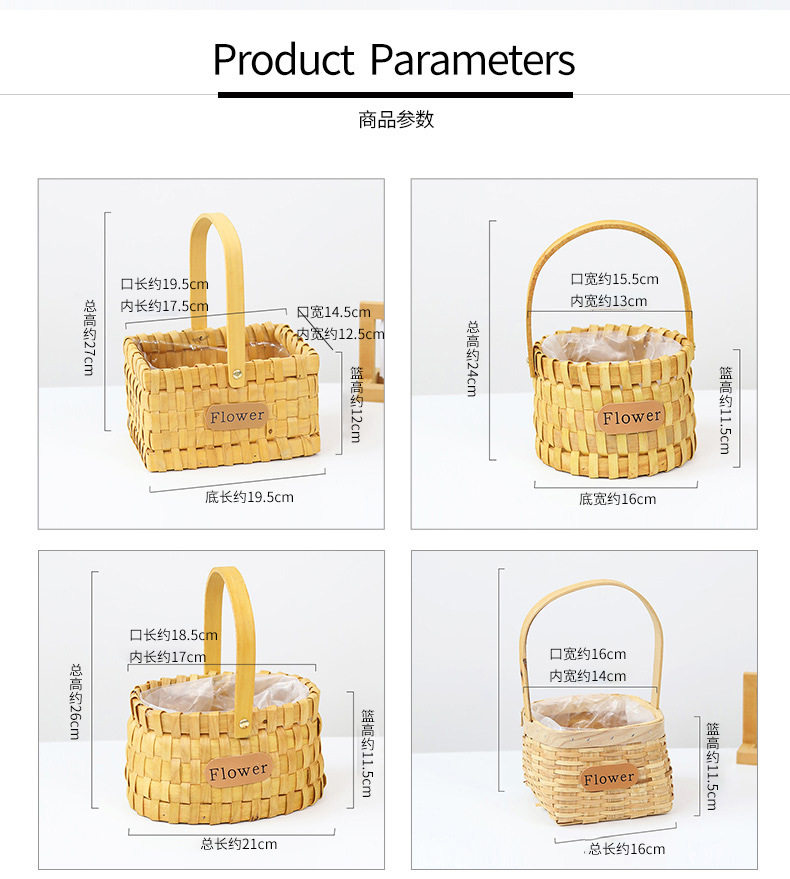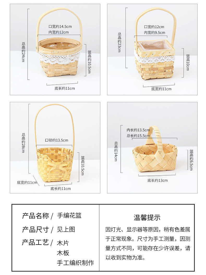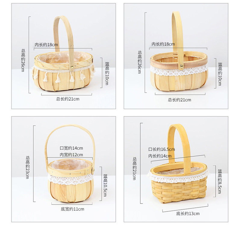 | Color | Wood chip flower basket - small pumpkin (with plastic lining),Wood chip flower basket - small round mouth and square bottom (with plastic lining),Wood chip flower basket - small square mouth and square bottom (with plastic lining),Wood chip flower basket - oval small lace (with plastic lining),Wood chip flower basket - oval large lace (with plastic lining),Wood chip flower basket - oval large tassel (with plastic lining),Wood chip flower basket-round mouth large flower (with plastic lining),Wood chip flower basket - large rectangular flower (with plastic lining),Wood chip flower basket - oval large flower (with plastic lining),Wicker basket-tassel princess basket small (with plastic lining),Wicker basket - tassel princess basket medium (with plastic lining),Wicker basket - tassel princess basket large (with plastic lining),Wicker basket - lace handle princess basket small (with plastic lining),Wicker basket - lace handle princess basket medium (with plastic lining),Wicker basket - lace handle princess basket large (with plastic lining),Wicker basket - off-white bow ribbon princess basket small (with plastic lining),Wicker basket - off-white bow ribbon princess basket medium (with plastic lining),Wicker basket - off-white bow ribbon princess basket large (with plastic lining),Wicker basket - lace handle oval large (with plastic lining) |