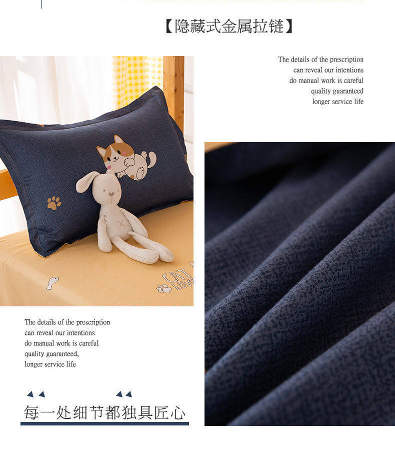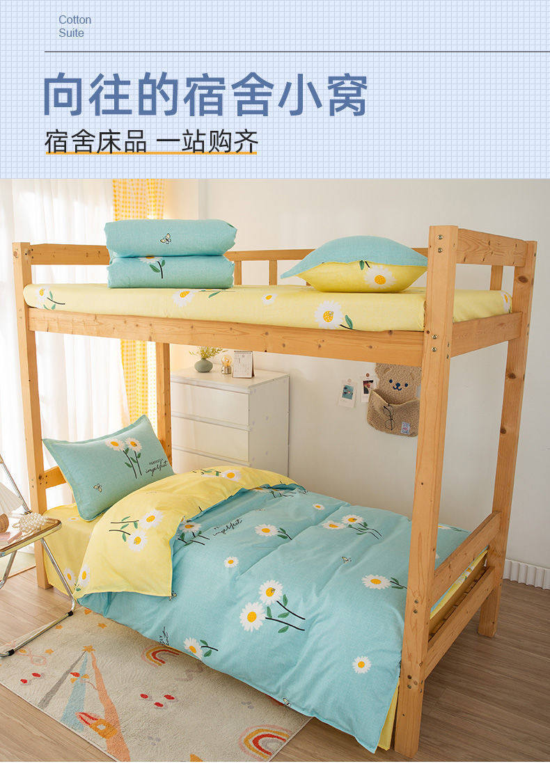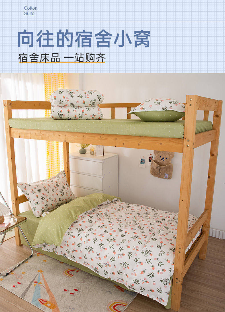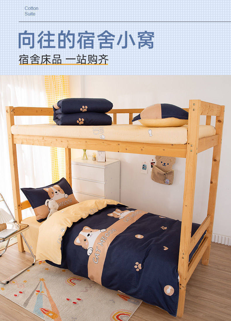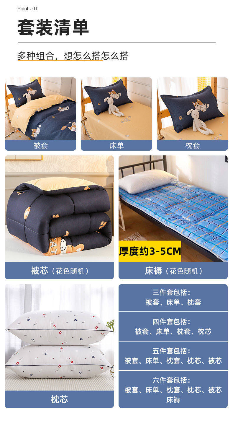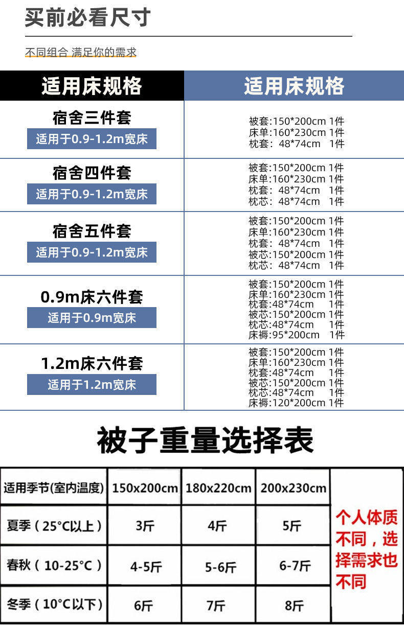 | Dimensions | Dormitory bed three-piece set (bed sheet + quilt cover + pillowcase),Dormitory bed four-piece set (three-piece set +1 pillow),Dormitory bed set of five (1 summer quilt + pillow),Dormitory bed five-piece set (3kg quilt + pillow),Dormitory bed five-piece set (4kg quilt + pillow),Dormitory bed set of five (5kg quilt + pillow),Dormitory bed five-piece set (6kg quilt core + pillow core),0.9 bed six-piece set (summer + pillow + mattress),0.9 bed six-piece set (3kg quilt + pillow core + mattress),0.9 bed six-piece set (4kg quilt + pillow core + mattress),0.9 bed six-piece set (5kg quilt + pillow core + mattress),0.9 bed six-piece set (6 Jins + pillow core + mattress),1.2 bed six-piece set (summer + pillow + mattress),1.2 bed six-piece set (3kg quilt + pillow core + mattress),1.2 bed six-piece set (4kg quilt + pillow core + mattress),1.2 bed six-piece set (5kg quilt + pillow core + mattress),1.2 bed six-piece set (6kg quilt + pillow core + mattress),Quilt cover 150*200 |