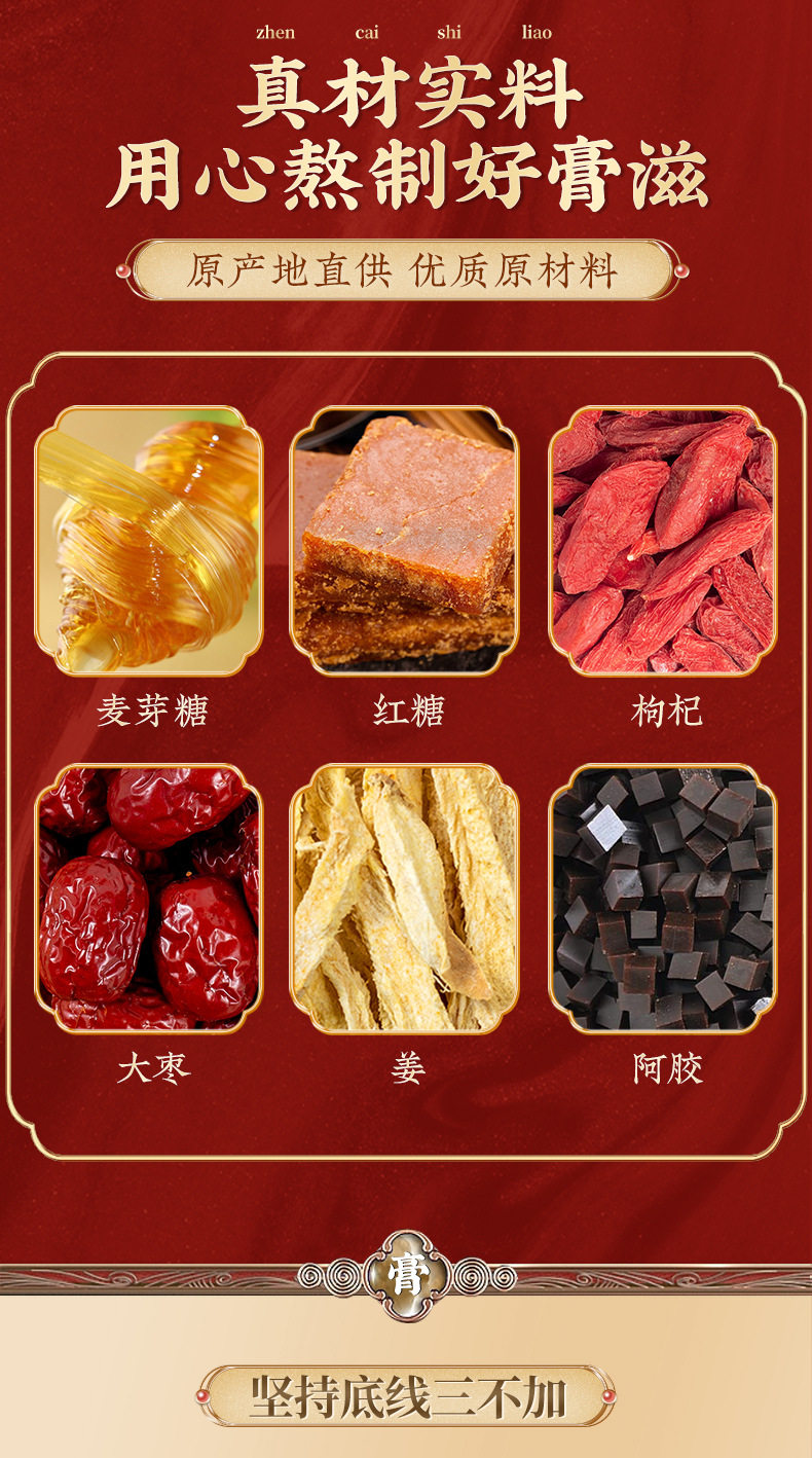 | Main raw materials | Maltose, brown sugar, medlar, jujube, ginger, donkey-hide gelatin |