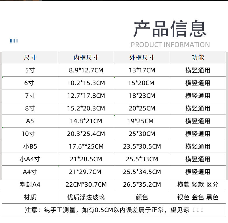 | Inner frame size | 5 inch silver (inside 8.9*12.7CM),5 inch gold (inside 8.9*12.7CM),5 inch black (inside 8.9*12.7CM),6 inch silver (inside 10.1*15.2CM),6 inch gold (inside 10.1*15.2CM),6 inch black (inside 10.1*15.2CM),7 inch silver (inside 12.7*17.8CM),7 inch gold (inside 12.7*17.8CM),7 inch black (inside 12.7*17.8CM),8 inch silver (inside 15.2*20.3CM),8 inch gold (inside 15.2*20.3CM),10 inch silver (built-in 20.3 * 25.CM),10 inch gold (inside 20.3 * 25.CM),A4 silver (containing 21*29.7CM),A4 gold (containing 21*29.7CM),A4 black (containing 21*29.7CM),A5 silver (installed 14.8*21CM),A5 gold (inside 14.8*21CM),B5 silver (installed 17.5*25CM),B5 gold (inside 17.5*25CM),Small A4 silver (containing 21*28.5CM),Small A4 gold (containing 21*28.5CM) |