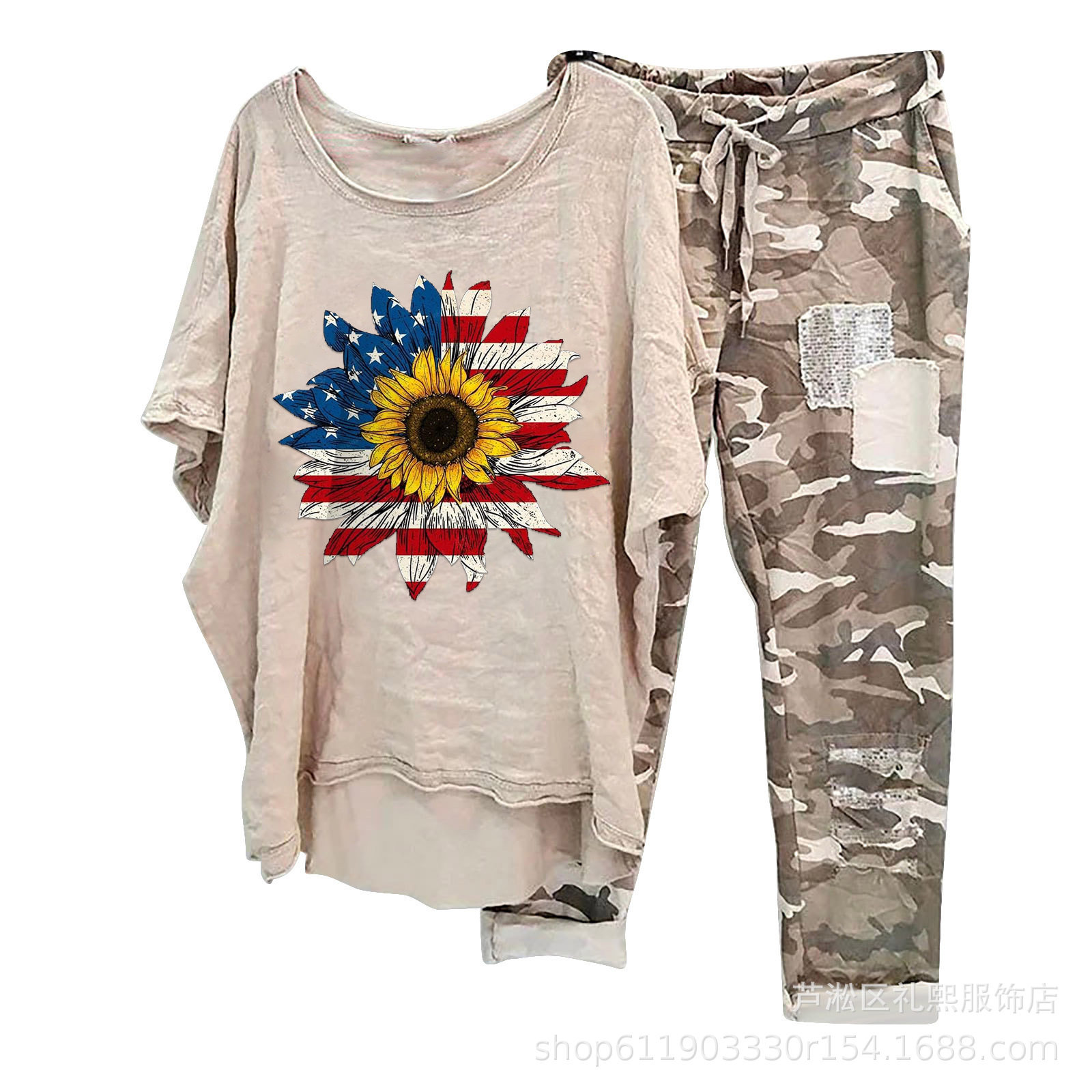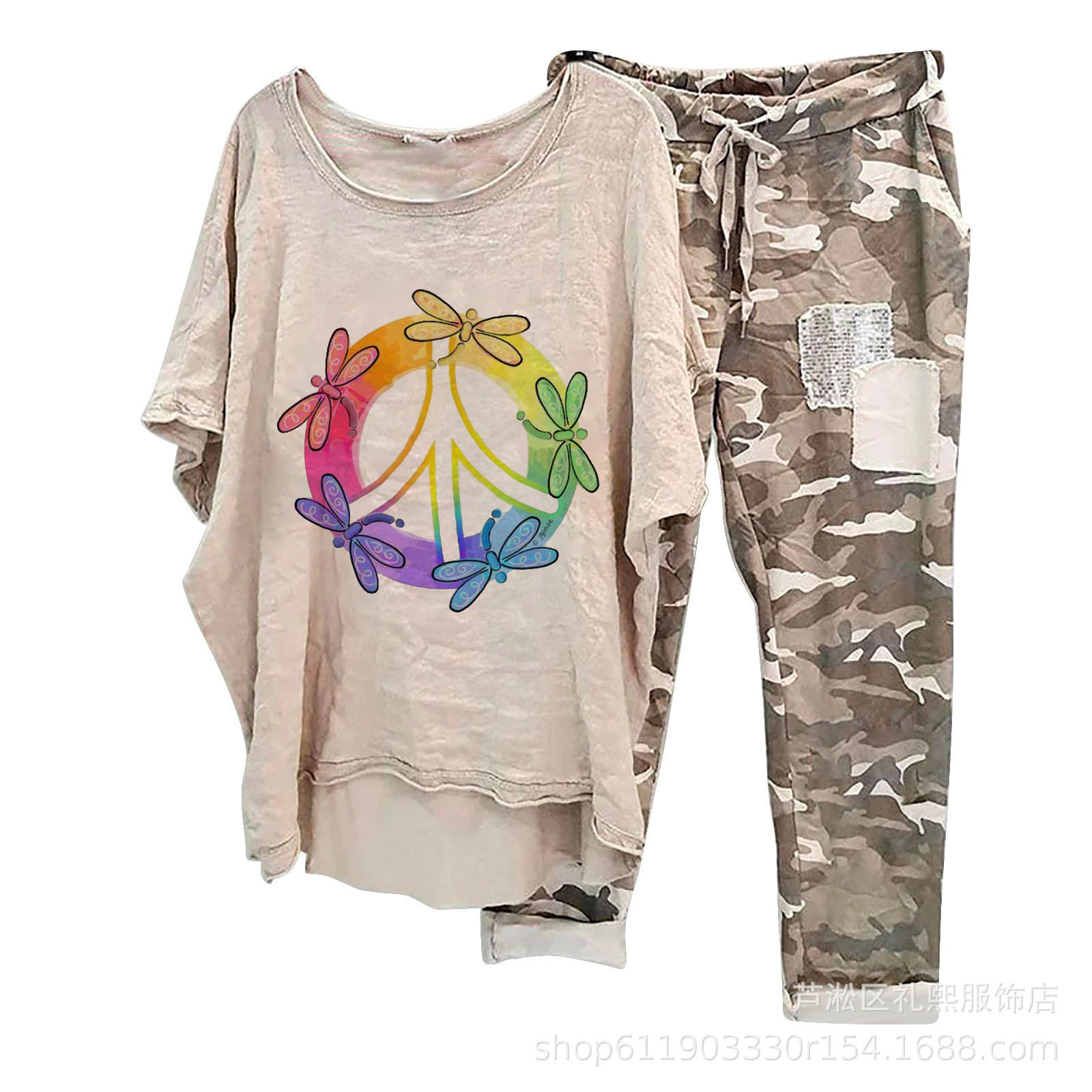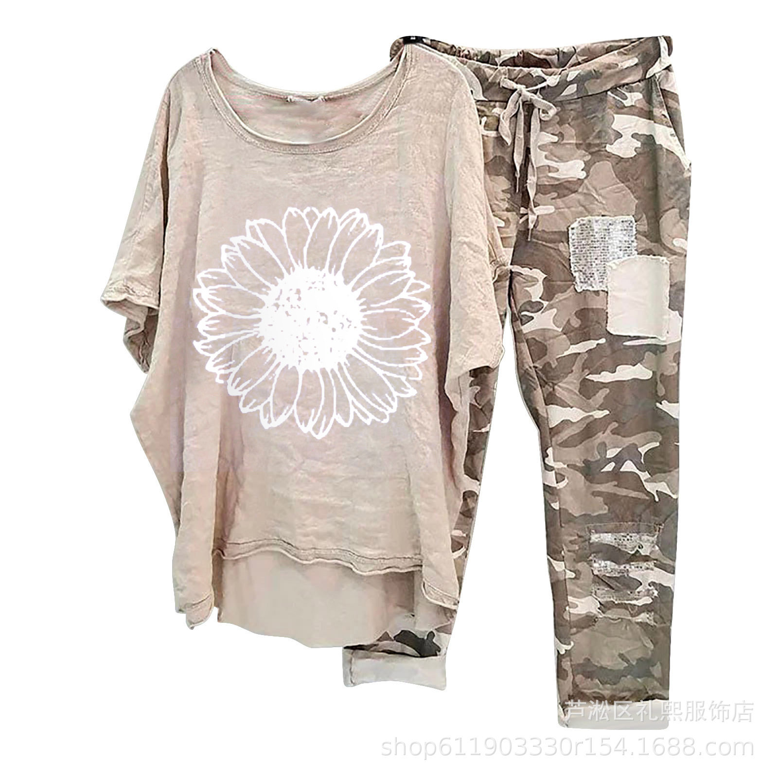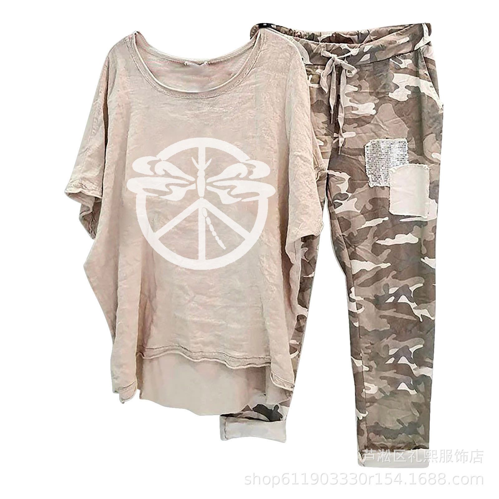 Cross-Border 2025 Spring and Summer Export New Casual Suit Women's Cotton and Linen Heat Transfer Amazon Top Printed Camouflage Sweatpants