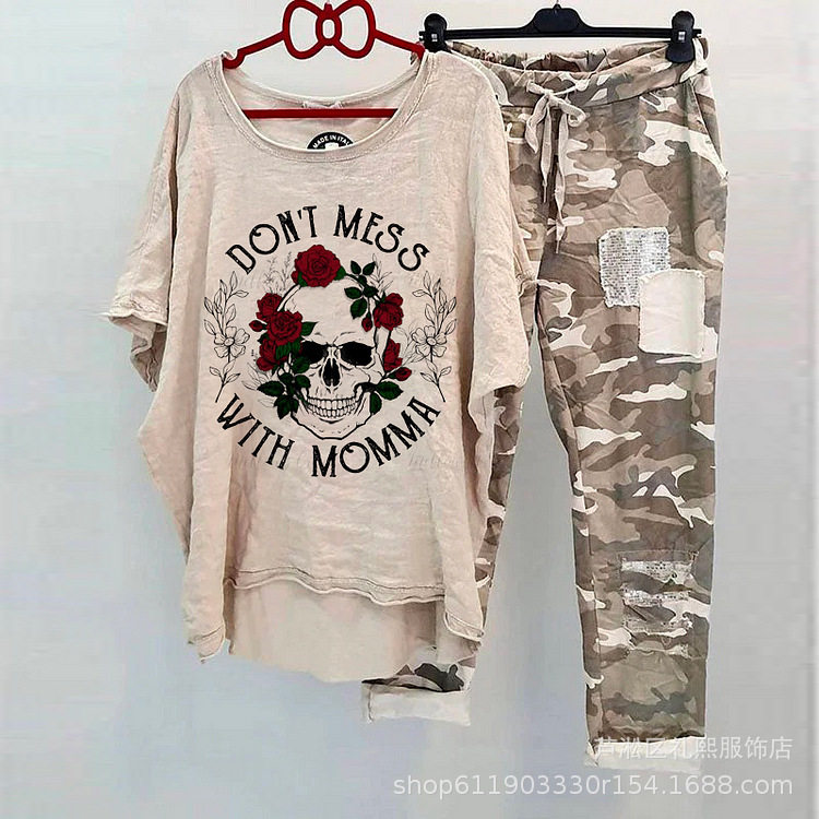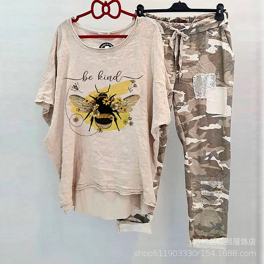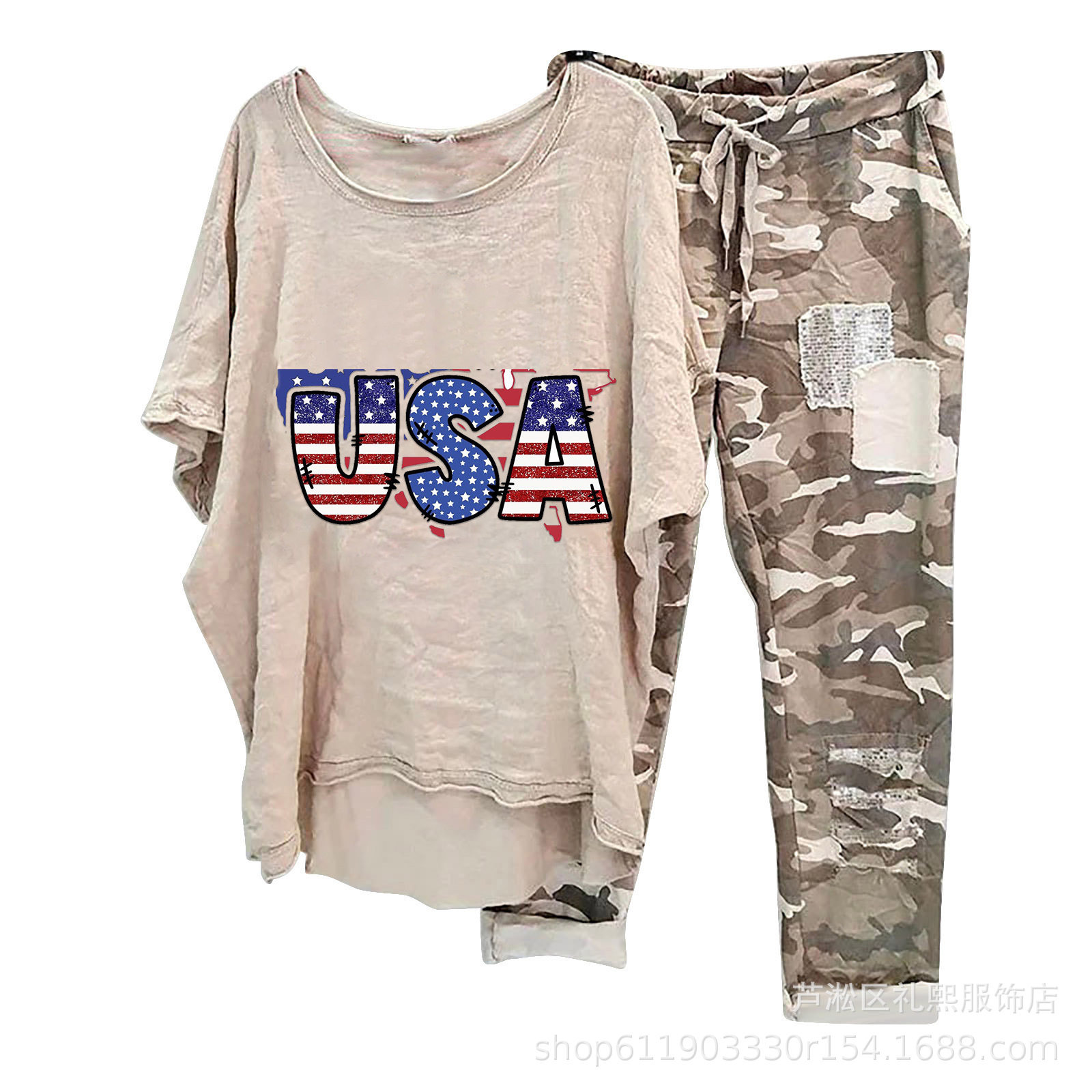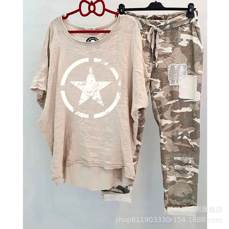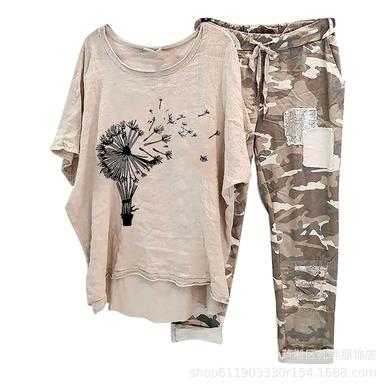 Cross-Border 2025 Spring and Summer Export New Casual Suit Women's Cotton and Linen Heat Transfer Amazon Top Printed Camouflage Sweatpants