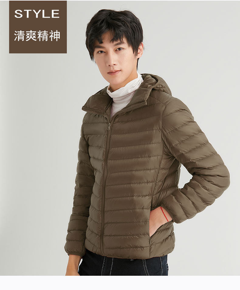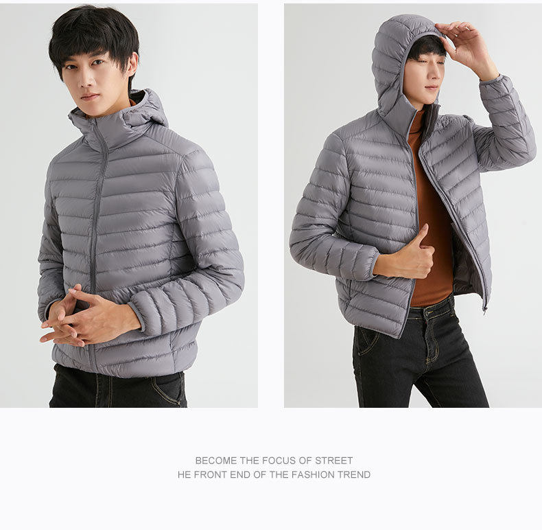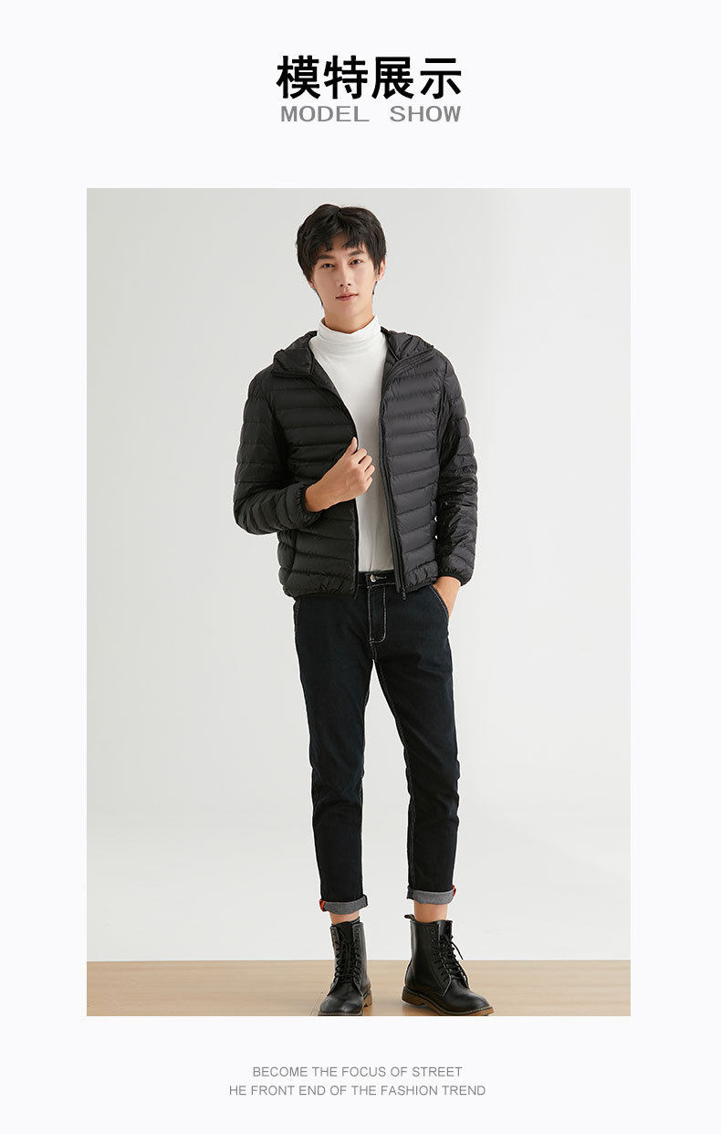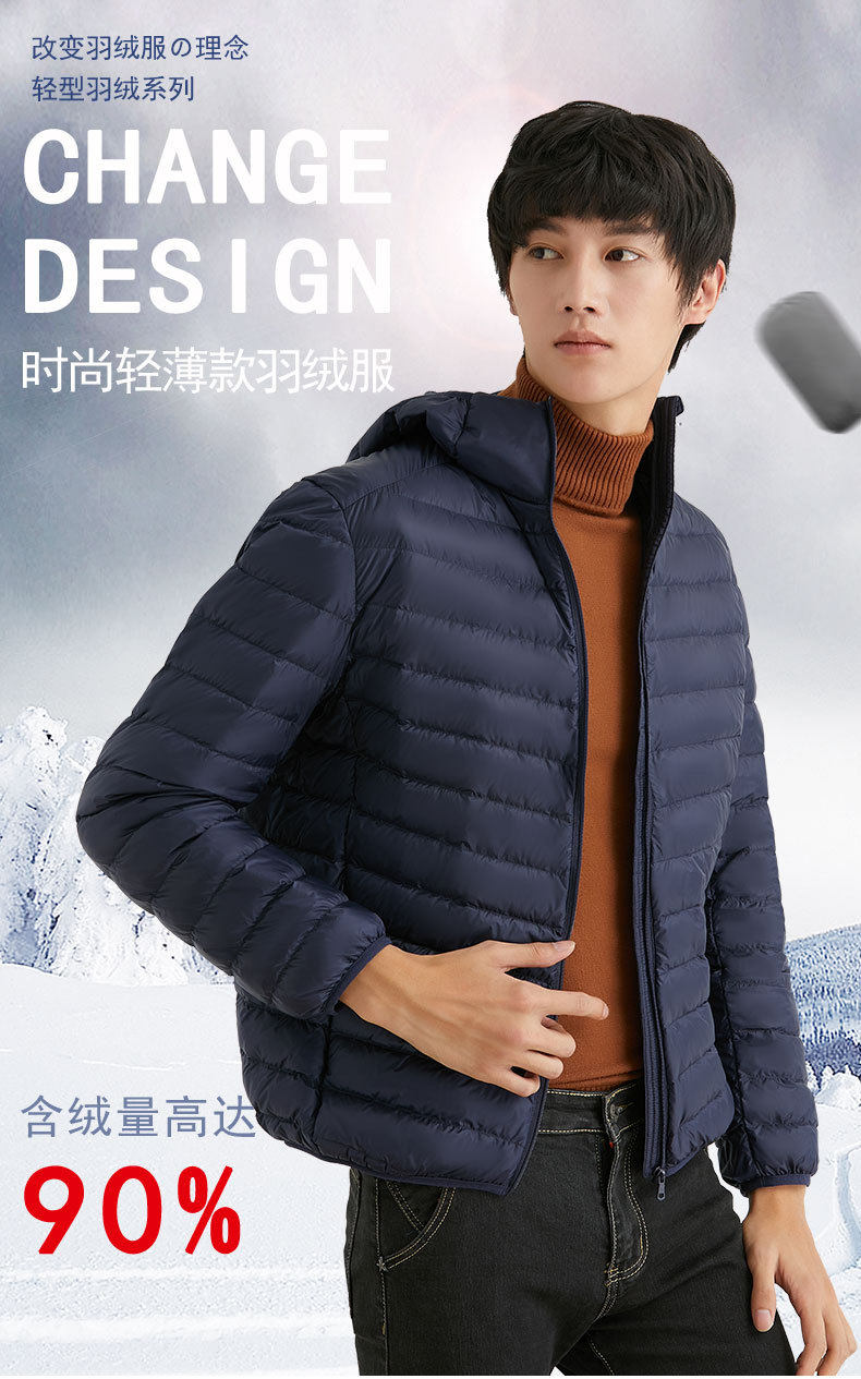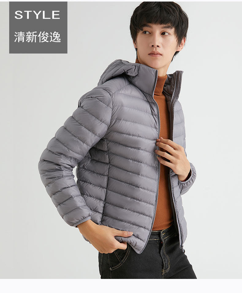 90 velvet men's hooded down jacket light short large size light foreign style white duck down jacket Pinghu down jacket wholesale