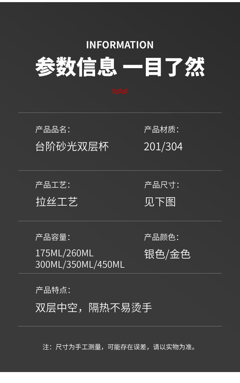 | Color | 304 double-layer step 175ml silver (sand outside and bright inside),304 double step 260ml silver (sand inside and outside),304 double step 300ml silver (sand inside and outside),304 double step 450ml silver (sand inside and outside),304 double-layer step 175ml gold (sand outside and bright inside),304 double step 260ml gold (sand inside and outside),304 double step 300ml gold (sand inside and outside),304 double step 450ml gold (sand inside and outside),304 double step 350ml silver (sand inside and outside),304 double step 350ml gold (sand inside and outside),304 double-layer step 550ml silver (sand outside and electrolysis inside),304 double-layer step 550ml gold (sand outside and electrolysis inside),304 double-layer straight sand 175ml silver (sand outside and bright inside),304 double layer straight sand 260ml silver (internal and external sand),304 double layer straight sand 300ml silver (internal and external sand),304 double layer straight sand 350ml silver (internal and external sand),304 double layer straight sand 450ml silver (internal and external sand),304 double-layer straight sand 550ml silver (sand outside and electrolysis inside),304 double-layer straight sand 650ml silver (outer sand and inner electrolysis),304 double-layer straight sand 175ml gold (sand outside and bright inside),304 double layer straight sand 260ml gold (internal and external sand),304 double layer straight sand 300ml gold (internal and external sand),304 double-layer straight sand 350ml gold (internal and external sand),304 double-layer straight sand 450ml gold (internal and external sand),304 double-layer straight sand 550ml gold (outer sand and inner electrolysis),304 double-layer straight sand 650ml gold (external sand and internal electrolysis) |