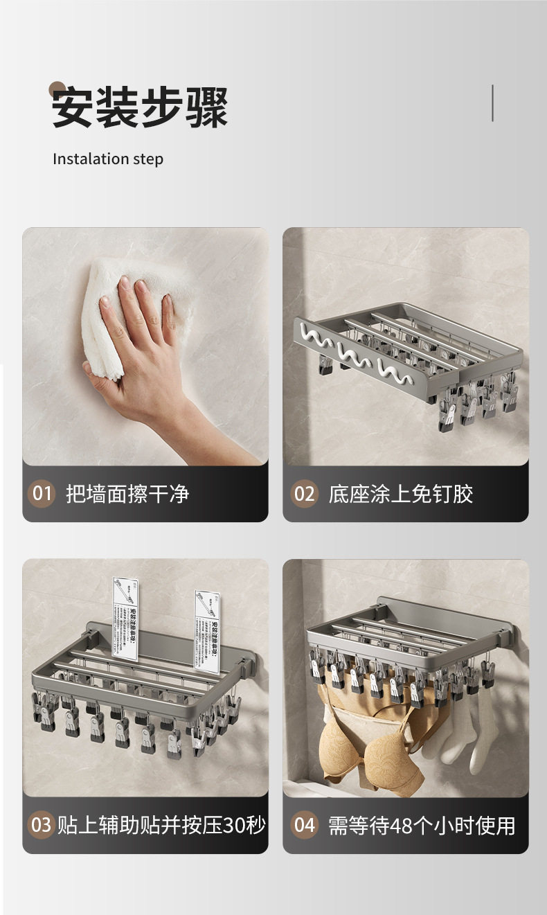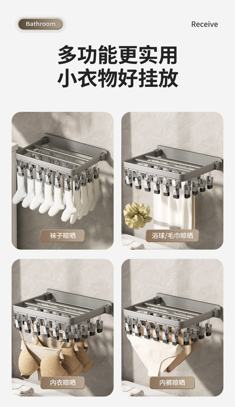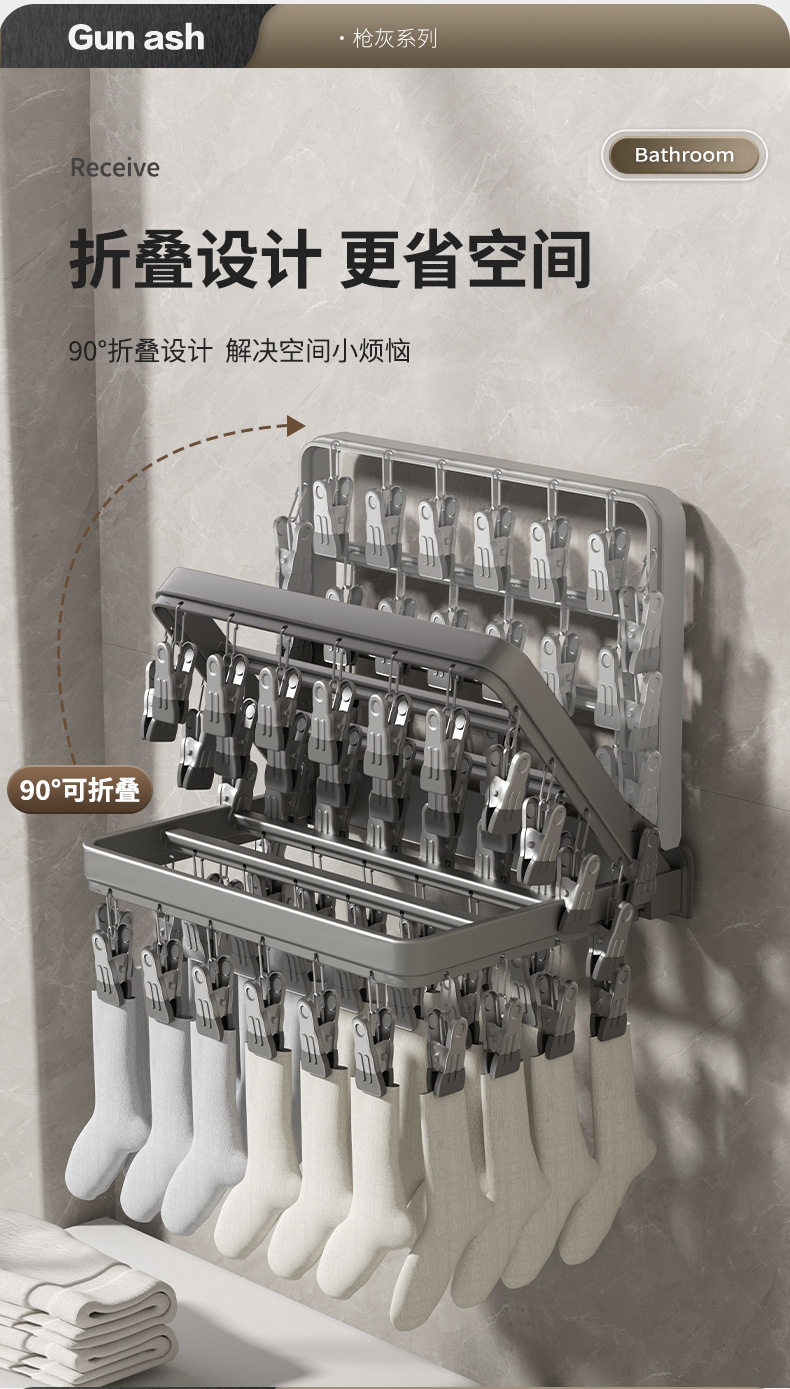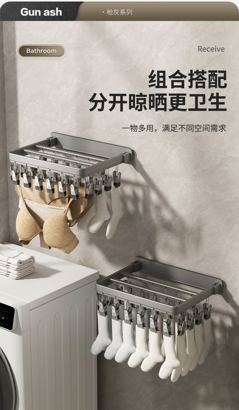 Folding Clothes Drying Rack Multi-Clip Wall-Mounted Sock Drying Artifact Home Balcony Windproof Intimates Baby Sock Rack