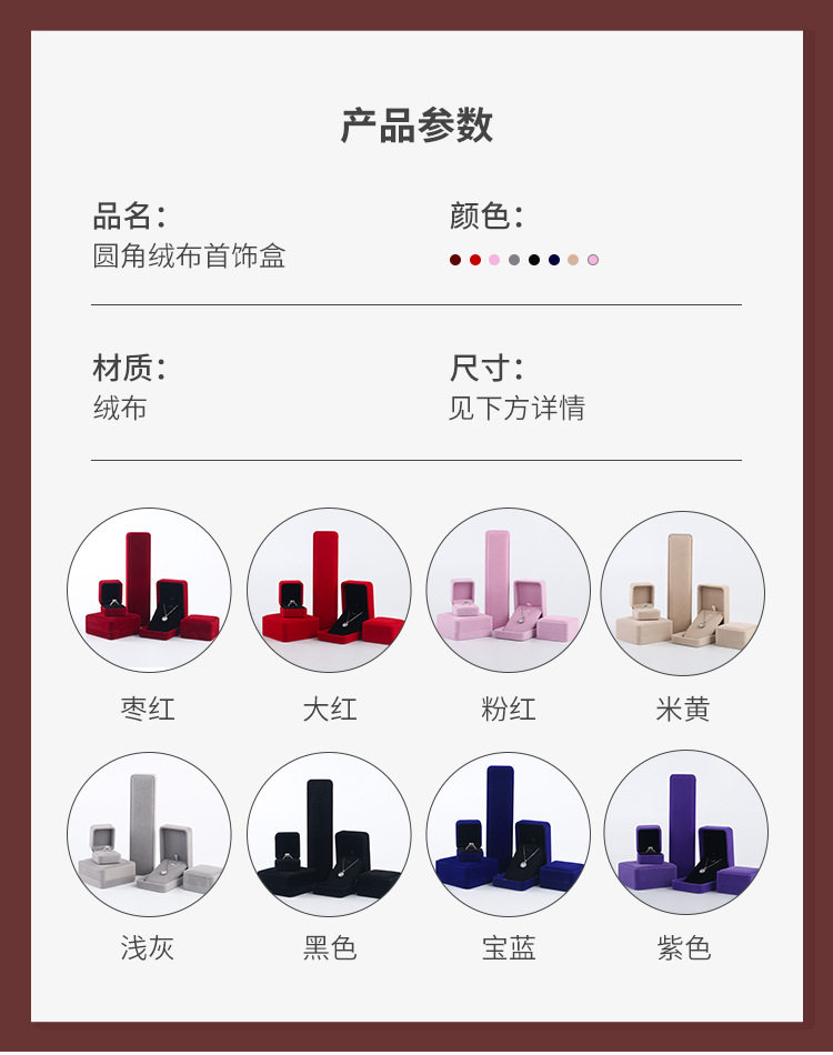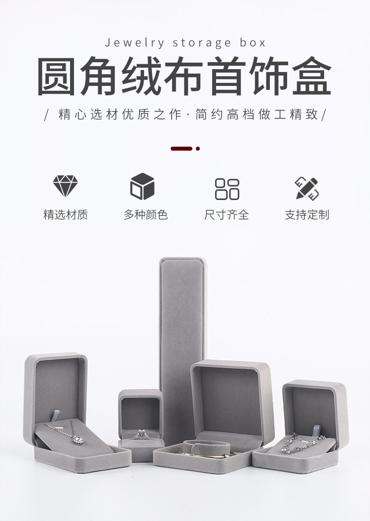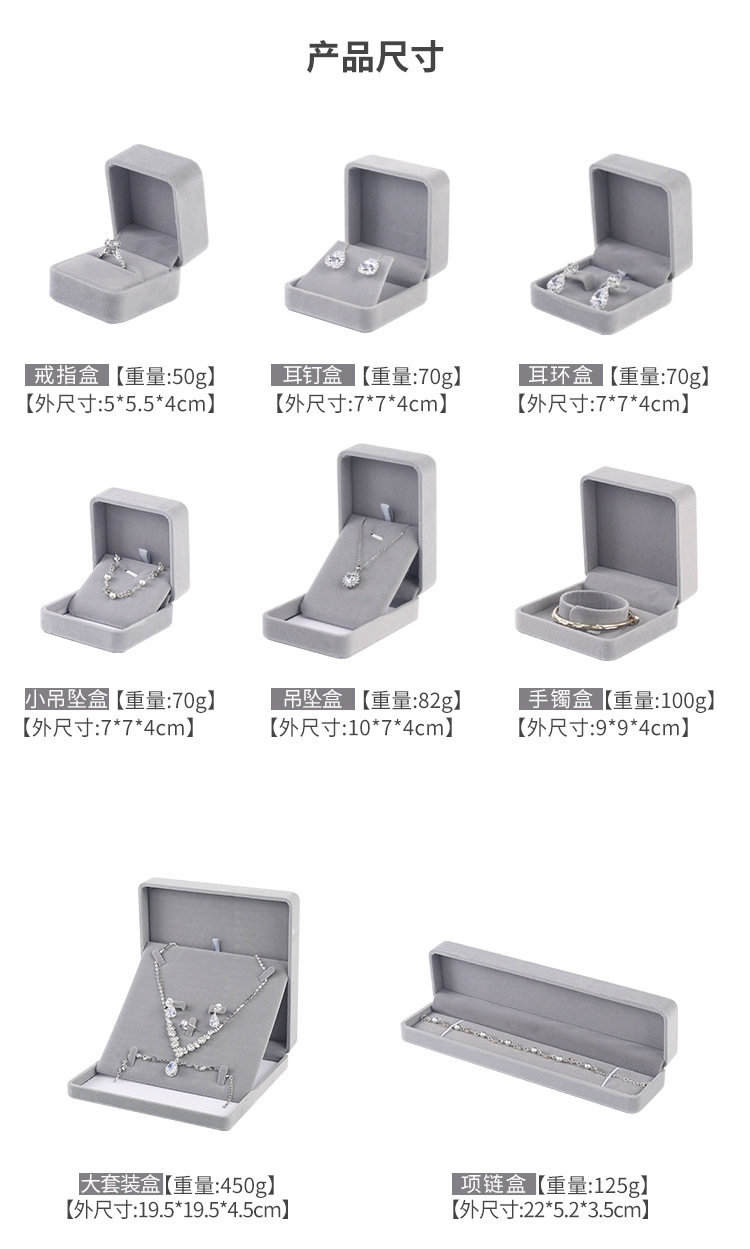 | Specification model | Gray; ring box (5*5.5*4),Gray; small pendant box (7*7*4),Gray; large pendant box (7*10*4),Gray; earring box (7*7*4),Gray; bracelet box (9*9*4),Gray; necklace box (22*5.2*3.5),Gray; small set box (12*16*4),Gray; large set box 19.5*19.5*4.5),Pink gray; ring box (5*5.5*4),Pink gray; small pendant box (7*7*4),Pink gray; large pendant box (7*10*4),Pink gray; earring box (7*7*4),Pink gray; bracelet box (9*9*4),Pink gray; necklace box (22*5.2*3.5),Pink gray; small set box (12*16*4),Pink gray; large set box 19.5*19.5*4.5),Red; ring box (5*5.5*4),Red; small pendant box (7*7*4),Red; large pendant box (7*10*4),Red; earring box (7*7*4),Red; bracelet box (9*9*4),Red; necklace box (22*5.2*3.5),Red; small set box (12*16*4),Red; large set box 19.5*19.5*4.5),Black; ring box (5*5.5*4),Black; small pendant box (7*7*4),Black; large pendant box (7*10*4),Black; earring box (7*7*4),Black; bracelet box (9*9*4),Black; necklace box (22*5.2*3.5),Black; small set box (12*16*4),Black; large set box 19.5*19.5*4.5),Maroon red; ring box (5*5.5*4),Maroon red; small pendant box (7*7*4),Maroon red; large pendant box (7*10*4),Maroon red; earring box (7*7*4),Maroon red; bracelet box (9*9*4),Maroon red; necklace box (22*5.2*3.5),Maroon red; small set box (12*16*4),Maroon red; large set box 19.5*19.5*4.5),Pink; ring box (5*5.5*4),Pink; small pendant box (7*7*4),Pink; large pendant box (7*10*4),Pink; earring box (7*7*4),Pink; bracelet box (9*9*4),Pink; necklace box (22*5.2*3.5),Pink; small set box (12*16*4),Pink; large set box 19.5*19.5*4.5),Beige; ring box (5*5.5*4),Beige; small pendant box (7*7*4),Beige; large pendant box (7*10*4),Beige; earring box (7*7*4),Beige; bracelet box (9*9*4),Beige; necklace box (22*5.2*3.5),Beige; small set box (12*16*4),Beige; large set box (19.5*19.5*4.5),Blue; ring box (5*5.5*4),Blue; small pendant box (7*7*4),Blue; large pendant box (7*10*4),Blue; earring box (7*7*4),Blue; bracelet box (9*9*4),Blue; necklace box (22*5.2*3.5),Blue; small set box (12*16*4),Blue; large set box 19.5*19.5*4.5),Purple; ring box (5*5.5*4),Purple; small pendant box (7*7*4),Purple; large pendant box (7*10*4),Purple; earring box (7*7*4),Purple; bracelet box (9*9*4),Purple; necklace box (22*5.2*3.5),Purple; small set box (12*16*4),Purple; large set box 19.5*19.5*4.5),Rounded gray eva inner ring box; ring box (5*5.5*4) |