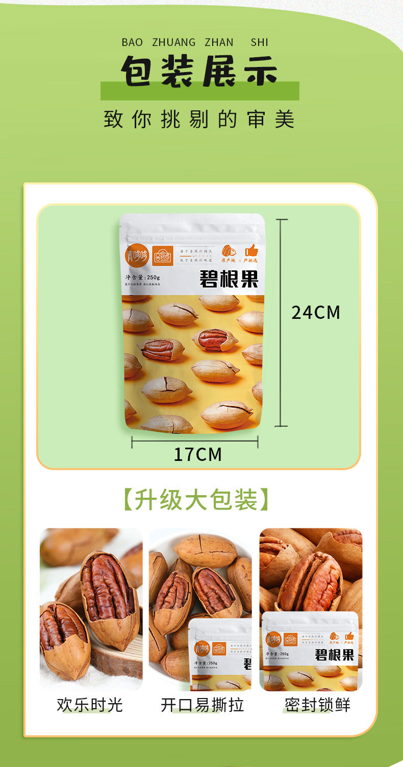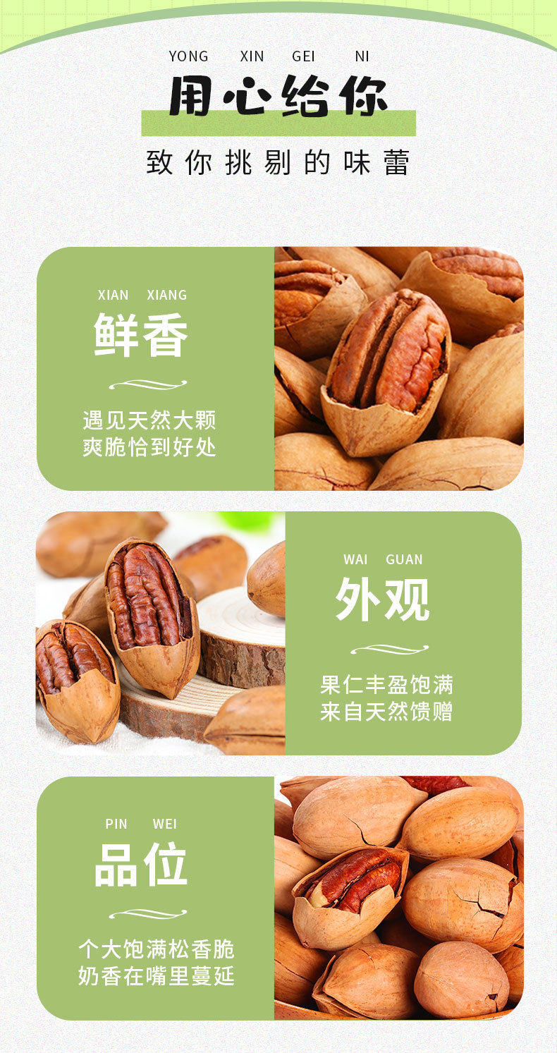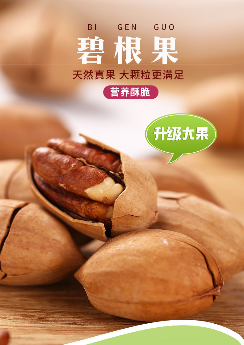 | Packaging specifications | Pecans 50g [creamy and crispy],Pecans 108g [creamy and crispy],Pecans 250g [creamy and crispy],Pecan canned 500g [milk flavored and crispy],Hawaiian fruit 108g,Happy fruit 108g,Charcoal roasted cashew nuts 108g,Milky walnuts 108g,Almond 108g,Northeastern pine nuts 108g,Xiaobai xing 108g,Fried rice 108g,Broad beans 108g,Melon seeds 108g,Green beans 108g,Hawthorn strips 108g,Multi-flavored peanuts 108g,Rice crust 100g,Red raisins 100g,Dried mango 108g,Banana slices 100g,Ramen balls 90g,Blackcurrant raisins 80g,Dried cranberries 80g |