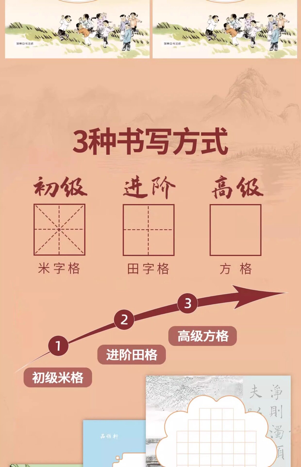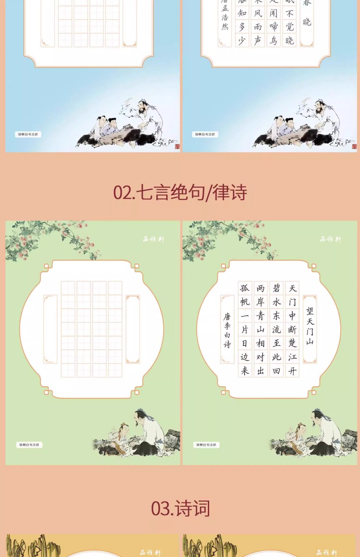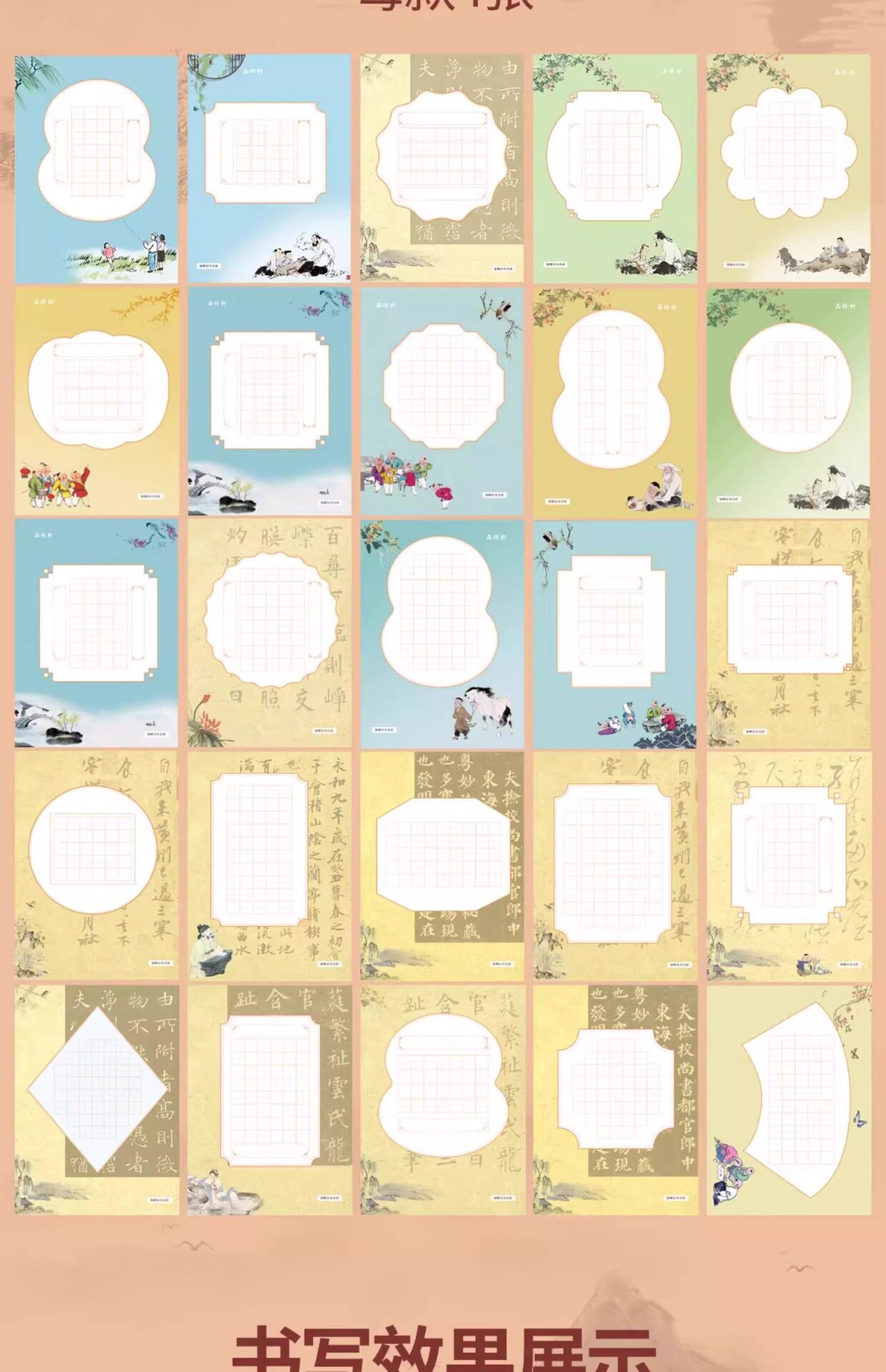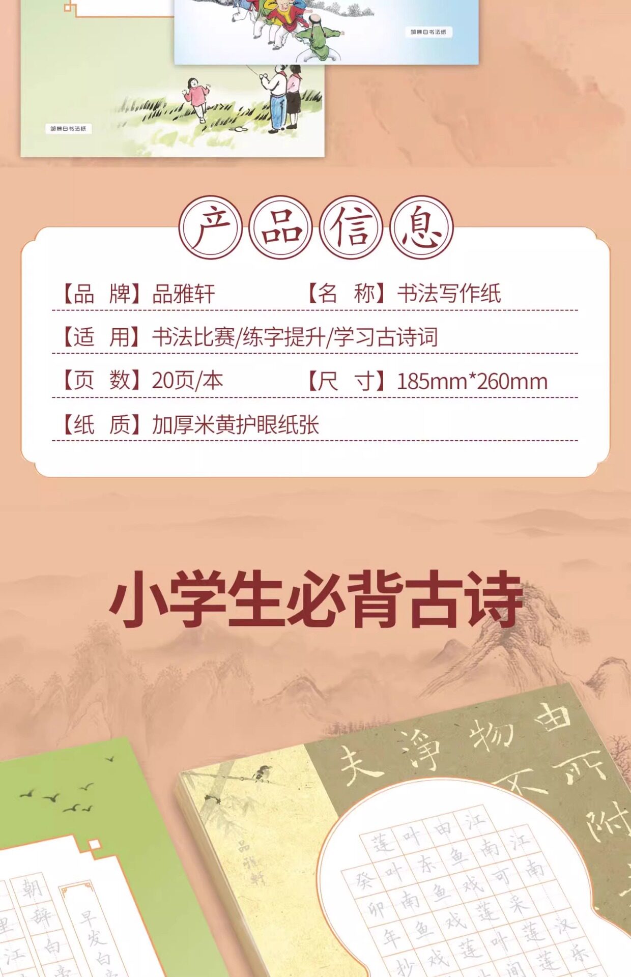 | Specification | Tian zi ge [20 styles, 20 pictures],Rice-shaped grid [20 styles, 20 pictures],Square【one】,Square【2】,Square【three】,Square【four】,Square【five】,Tian zi ge【20 photos】,Rice-shaped grid【20 pictures】,Square【20 pictures】,(3 books with 20 styles, 60 pictures in total) 1 book with tianzi grids + 1 book with square grids + 1 book with rice grids,(3 books, 20 styles, 60 pictures in total) tian zi ge,(3 books, 20 styles, 60 pictures in total) square grid,Ancient poems for primary school (3 books, 60 pictures),(3 books, 20 styles, 60 pictures in total) rice-shaped grid,(5 books with 20 styles, 100 pictures in total) 2 books with tianzi grids + 1 book with square grids + 2 books with rice grids,(5 books, 20 styles, 100 pictures in total) tian zi ge,(5 books, 20 styles, 100 pictures in total) square grid,(5 books, 20 styles, 100 pictures in total) rice grid,100 sheets of 5-meter grids + 60 sheets of ancient poems for primary school students,5 honda character grids 100 sheets + primary school students’ ancient poems 60 sheets,100 sheets of 5 squares + 60 ancient poems for primary school students,(10 books, 20 styles, 200 pictures in total) 4 books with tianzi grids + 2 books with square grids + 4 books with rice grids,(10 books, 20 styles, 200 pictures in total) tian zi ge,(10 books, 20 styles, 200 pictures in total) square grid,(10 books, 20 styles, 200 pictures in total) rice-shaped grids,(15 books, 20 styles, 300 pictures in total) 5 books with tianzi grids + 5 books with square grids + 5 books with rice grids,(15 books, 20 styles, 300 pictures in total) tian zi ge,(15 books, 20 styles, 300 pictures in total) square grid,(15 books, 20 styles, 300 pictures in total) rice grid |