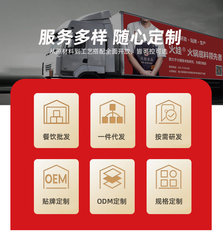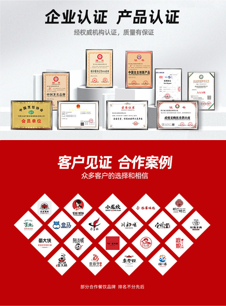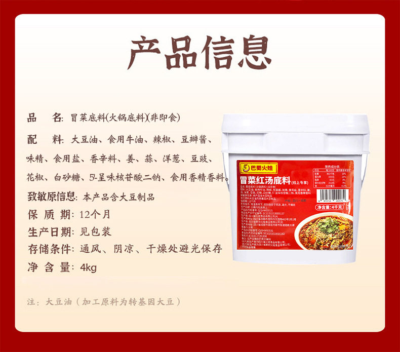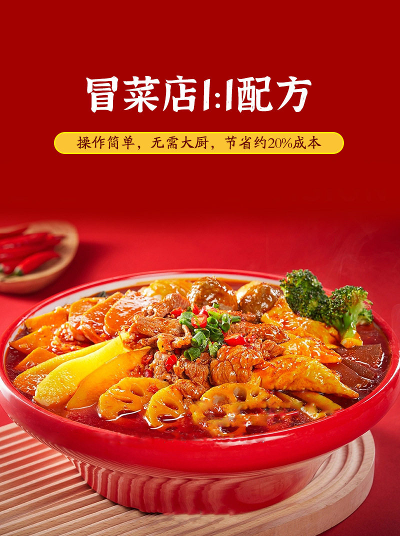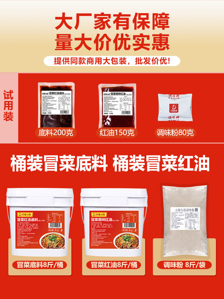 | Packaging specifications | Red soup trial pack 430g (can cook 2kg dishes),Maocai base 200g*3 bags,Maocai red oil 150g*3 bags,4kg of maocai base (catering package can be mixed with 40kg water),Maocai red oil 4kg (increases spiciness and fragrance),Compound seasoning powder 4kg (increases flavor and aroma),【dry mixed maocai】dry mixed malatang sauce 500g,[essential for roast duck] braised roast duck red oil 500g (sauce flavor),【rich tomato flavor】tomato base 300g (dilution ratio: 1:5),【clear broth】mushroom soup base 100g (mixing ratio: 1:15),Golden soup pickled cabbage seasoning 500g (water ratio 1:4),[refreshing sour soup] hot and sour golden soup base 250g (water ratio 1:5) |