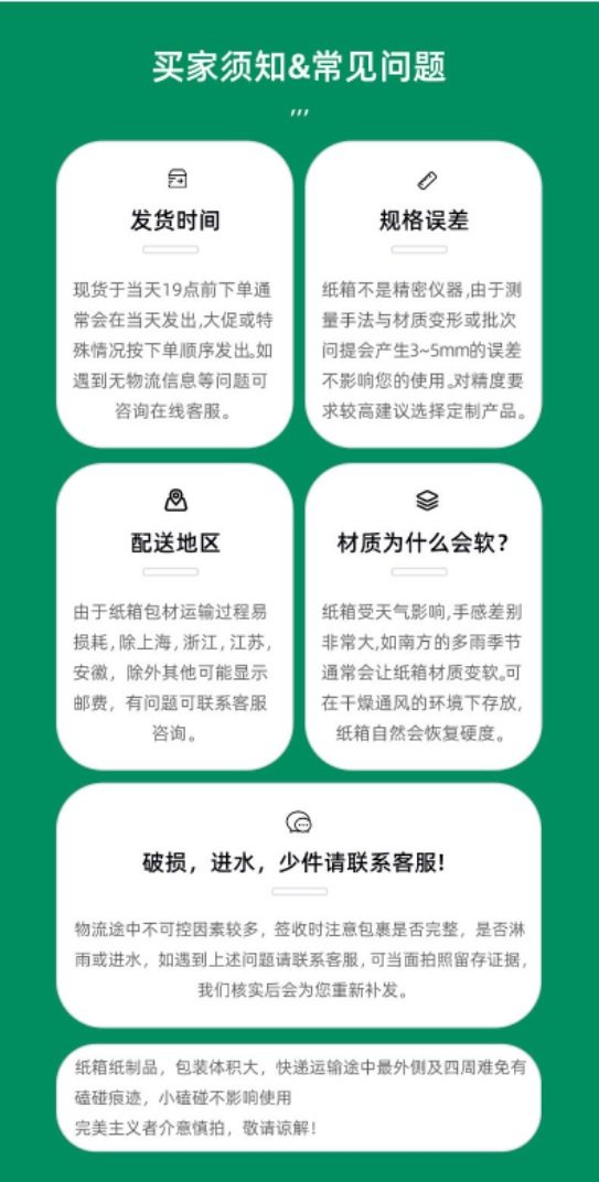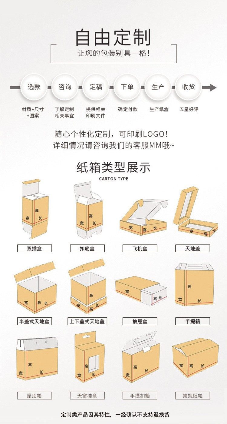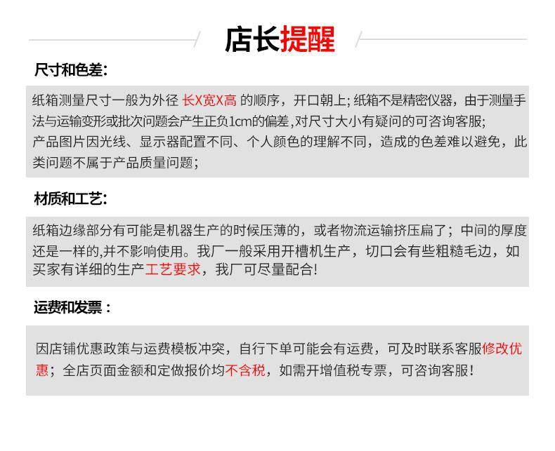 Specification model 10*10*4cm; three-layer extra hard e corrugated thickness 1-2mm; white card surface + white paper inside,15*10*4cm; three layers of extra hard e corrugated thickness 1-2mm; white card surface + white paper inside,15*10*5cm; three layers of extra hard e corrugated thickness 1-2mm; white card surface + white paper inside,13*12*5cm; three layers of extra hard e corrugated thickness 1-2mm; white card surface + white paper inside,15*15*5cm; three layers of extra hard e corrugated thickness 1-2mm; white card surface + white paper inside,20*14*4cm; three layers of extra hard e corrugated thickness 1-2mm; white card surface + white paper inside,13*12*7cm; three layers of extra hard e corrugated thickness 1-2mm; white card surface + white paper inside,18*11*5cm; three layers of extra hard e corrugated thickness 1-2mm; white card surface + white paper inside,18*18*5cm; three layers of extra hard e corrugated thickness 1-2mm; white card surface + white paper inside,16*16*6cm; three layers of extra hard e corrugated thickness 1-2mm; white card surface + white paper inside,16*16*7cm; three layers of extra hard e corrugated thickness 1-2mm; white card surface + white paper inside,20*13*3cm; three layers of extra hard e corrugated thickness 1-2mm; white card surface + white paper inside,20*11*4cm; three layers of extra hard e corrugated thickness 1-2mm; white card surface + white paper inside,23*16*5cm; three layers of extra hard e corrugated thickness 1-2mm; white card surface + white paper inside,23*13*7cm; three layers of extra hard e corrugated thickness 1-2mm; white card surface + white paper inside,25*20*7cm; three layers of extra hard e corrugated thickness 1-2mm; white card surface + white paper inside,27*18*4.5cm; three layers of extra hard e corrugated thickness 1-2mm; white card surface + white paper inside,27*16*5cm; three layers of extra hard e corrugated thickness 1-2mm; white card surface + white paper inside,27*16*6cm; three layers of extra hard e corrugated thickness 1-2mm; white card surface + white paper inside,30*20*5cm; three layers of extra hard e corrugated thickness 1-2mm; white card surface + white paper inside,30*20*10cm; three layers of extra hard e corrugated thickness 1-2mm; white card surface + white paper inside,30*26*6cm; three layers of extra hard e corrugated thickness 1-2mm; white card surface + white paper inside,31*22*4cm; three layers of extra hard e corrugated thickness 1-2mm; white card surface + white paper inside,33*24*4cm; three layers of extra hard e corrugated thickness 1-2mm; white card surface + white paper inside,36*26*6cm; three layers of extra hard e corrugated thickness 1-2mm; white card surface + white paper inside,30*20*8cm; three layers of extra hard e corrugated thickness 1-2mm; white card surface + white paper inside,38*26*6cm; three layers of extra hard e corrugated thickness 1-2mm; white card surface + white paper inside,38*29*7cm; three layers of extra hard e corrugated thickness 1-2mm; white card surface + white paper inside,40*30*4cm; three layers of extra hard e corrugated thickness 1-2mm; white card surface + white paper inside,40*30*5cm; three layers of extra hard e corrugated thickness 1-2mm; white card surface + white paper inside,40*30*6cm; three layers of extra hard e corrugated thickness 1-2mm; white card surface + white paper inside,40*30*8cm; three layers of extra hard e corrugated thickness 1-2mm; white card surface + white paper inside,40*30*10cm; three layers of extra hard e corrugated thickness 1-2mm; white card surface + white paper inside,40*30*12cm; three layers of extra hard e corrugated thickness 1-2mm; white card surface + white paper inside,42*32*7cm; three layers of extra hard e corrugated thickness 1-2mm; white card surface + white paper inside,45*35*8cm; three layers of extra hard e corrugated thickness 1-2mm; white card surface + white paper inside,45*35*10cm; three layers of extra hard e corrugated thickness 1-2mm; white card surface + white paper inside,50*35*10cm; three layers of extra hard e corrugated thickness 1-2mm; white card surface + white paper inside,55*35*10cm; three layers of extra hard e corrugated thickness 1-2mm; white card surface + white paper inside,55*45*8cm; three layers of extra hard e corrugated thickness 1-2mm; white card surface + white paper inside