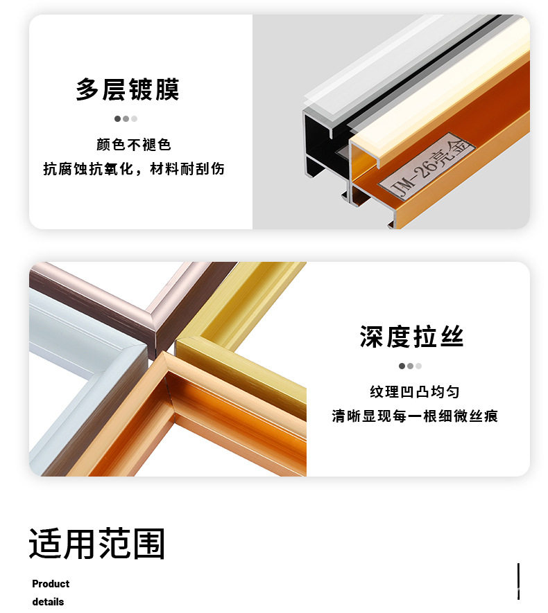 | Inner frame size | JM-01 [brushed dumb gold] (unit price/meter),JM-01 [brushed dumb Silver] (unit price/meter),JM-01 [brushed dumb black] (unit price/meter),JM-01 [brushed purple gold] (unit price/meter),JM-01 [brushed bright gold] (unit price/meter) |