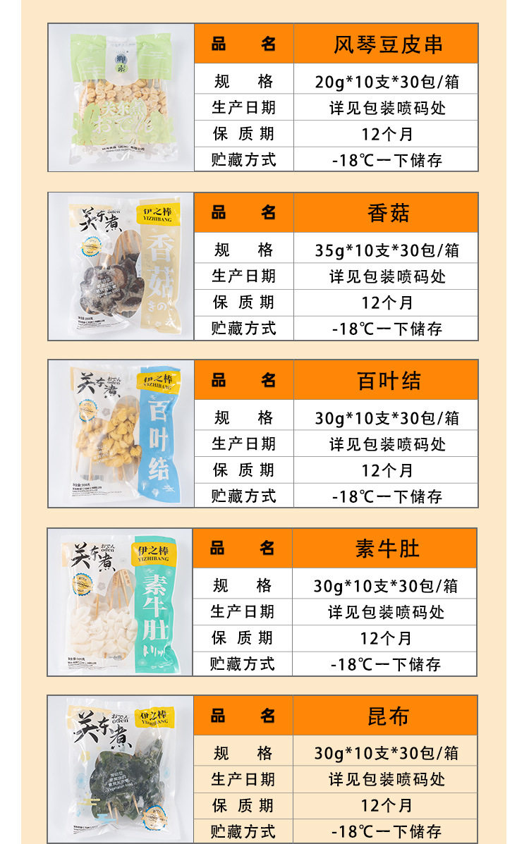 | Packaging specifications | Vegetarian tripe 300g,Kelp 300g,Venetian knot 300g,410g bamboo shoot tips,350g shiitake mushrooms,Organ string 200g,720g radish (6 pieces),Xizhichuan organ string 200g,Xizhichuan konjac hairy belly skewers 400g,Xizhichuan konjac silk knot 600g,Xizhichuan bean curd bean curd skewers 400g,Xizhichuan kelp skewers 350g |