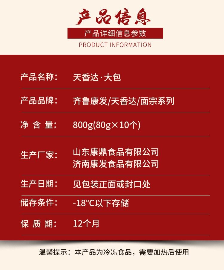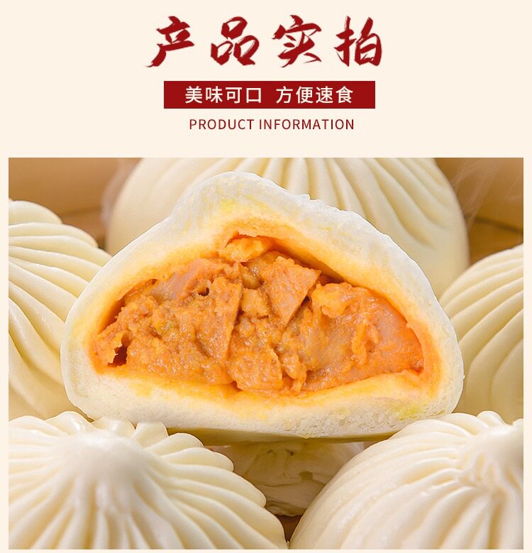 | Packaging specifications | Kangfa orleans chicken 80g*10 pieces,Kangfa sauce pork buns 80g*10 pieces,Kangfa curry beef 80g*10 pieces,Kangfa mushroom and vegetable buns 80g*10 pieces,Kangfa mustard egg buns 80g*10 pieces,Kangfa tofu vegetarian buns 80g*10 pieces,Kangfa pork and cabbage buns 80g*10 pieces,Kangfa bean meat buns 80g*10 pieces,Kangfa corn meat rolls 80g*10 pieces,Kangfa meat rolls 80g*10 pieces,Kangfa pork and green onions 80g*10 pieces,Kangfa sauce-flavored xiaolongbao |
