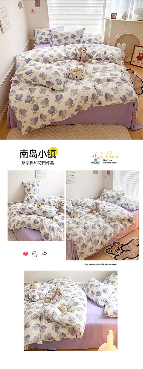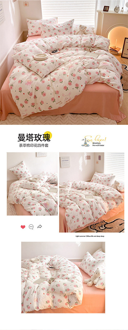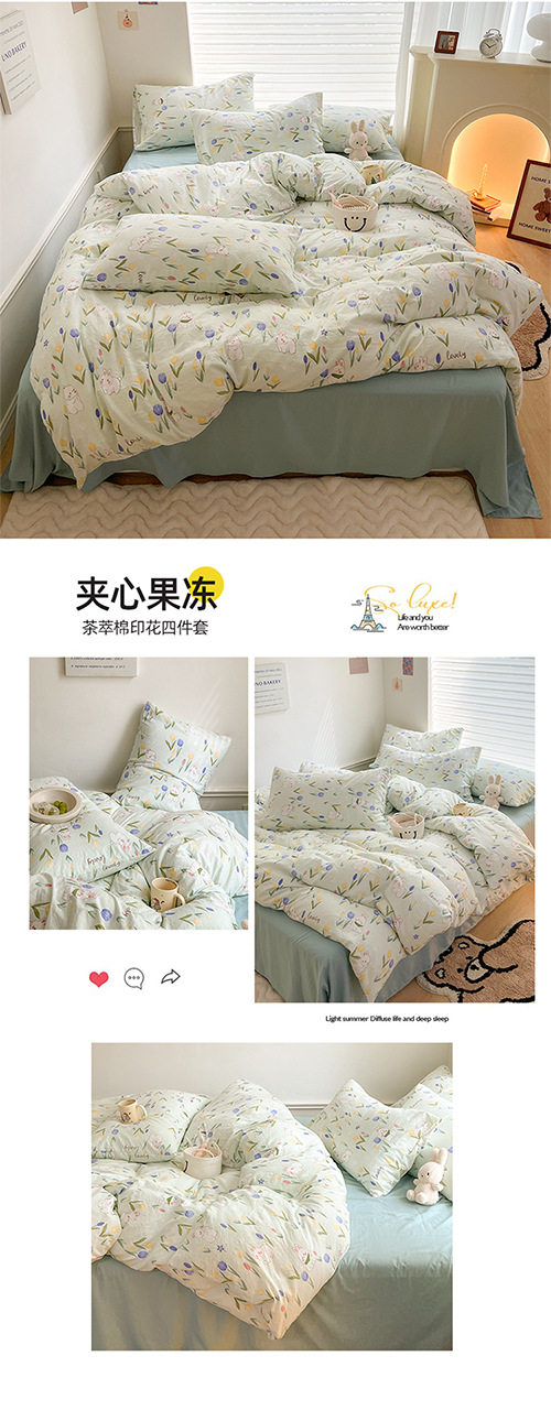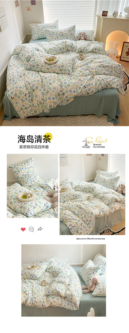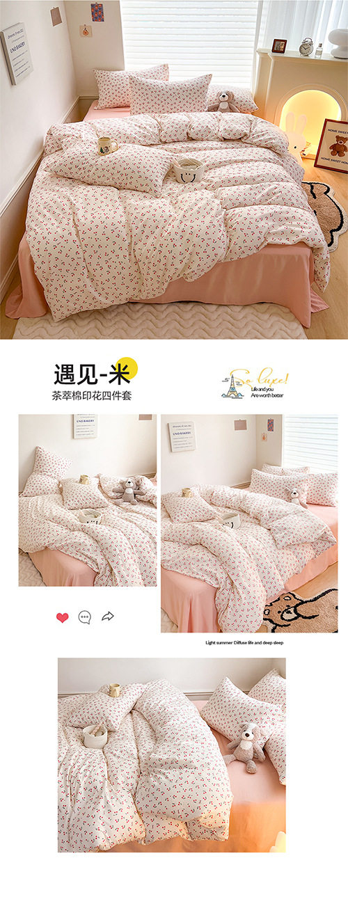 | Dimensions | 1.2m bed sheet three-piece set [quilt cover 150*200cm],1.5m bed sheet four-piece set [quilt cover 150*200cm],1.8m bed sheet four-piece set [quilt cover 180*220cm],2.0m bed sheet four-piece set [quilt cover 200*230cm],2.2m bed sheet four-piece set [quilt cover 220*240cm],1.5m fitted sheet set of four [fitted sheet 150*200cm],1.8m fitted sheet set of four [fitted sheet 180*200cm],150*200cm single quilt cover,180*220cm single quilt cover,200*230cm single quilt cover,220*240cm single quilt cover |