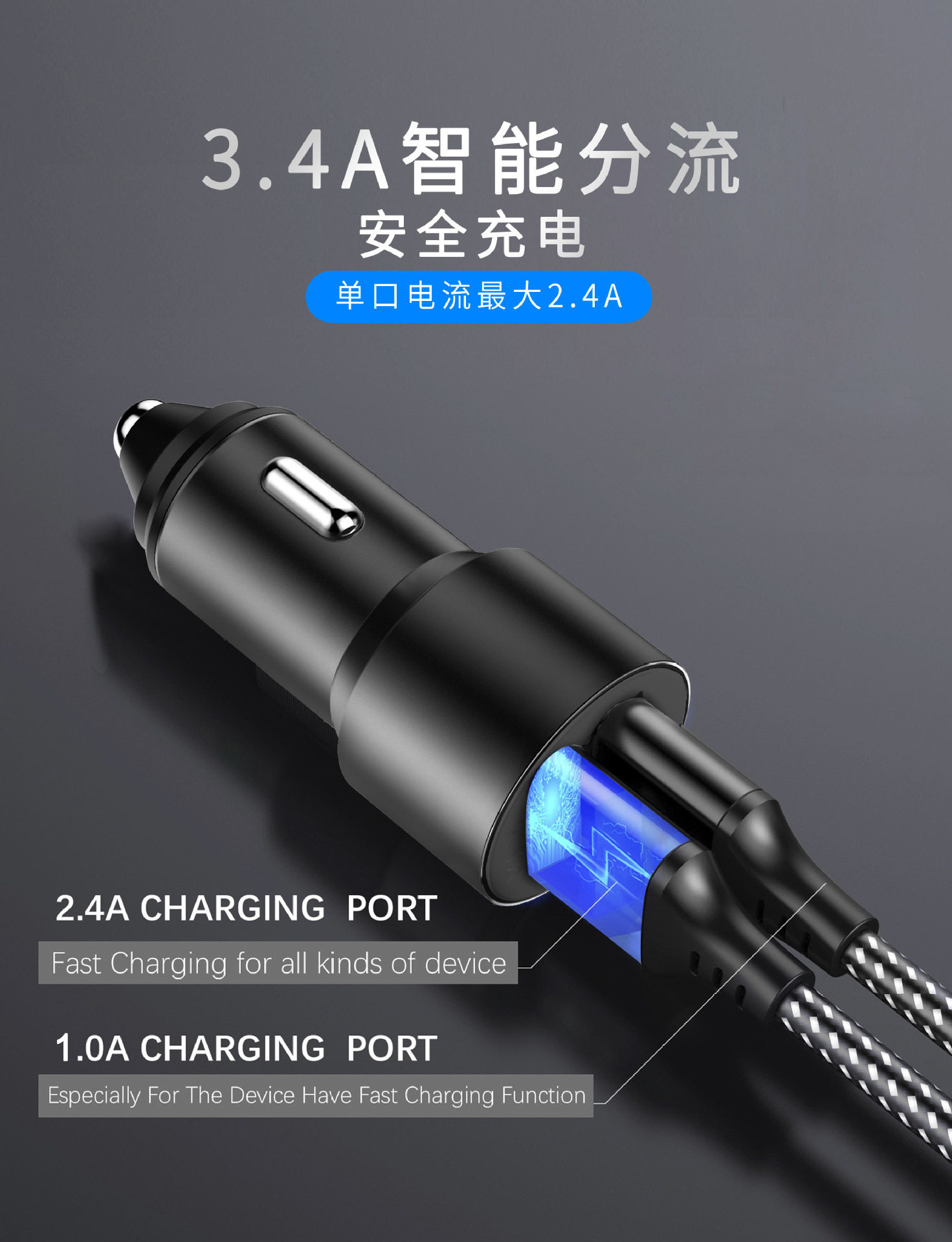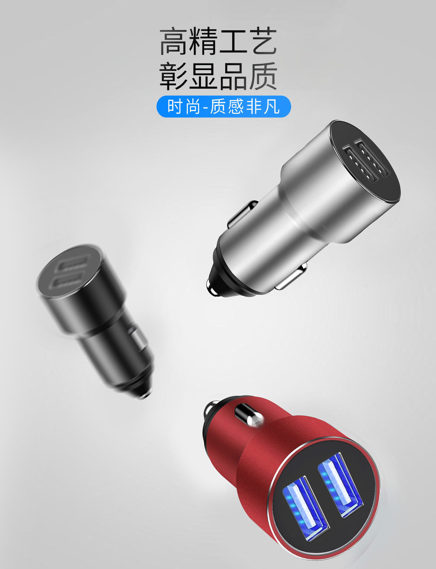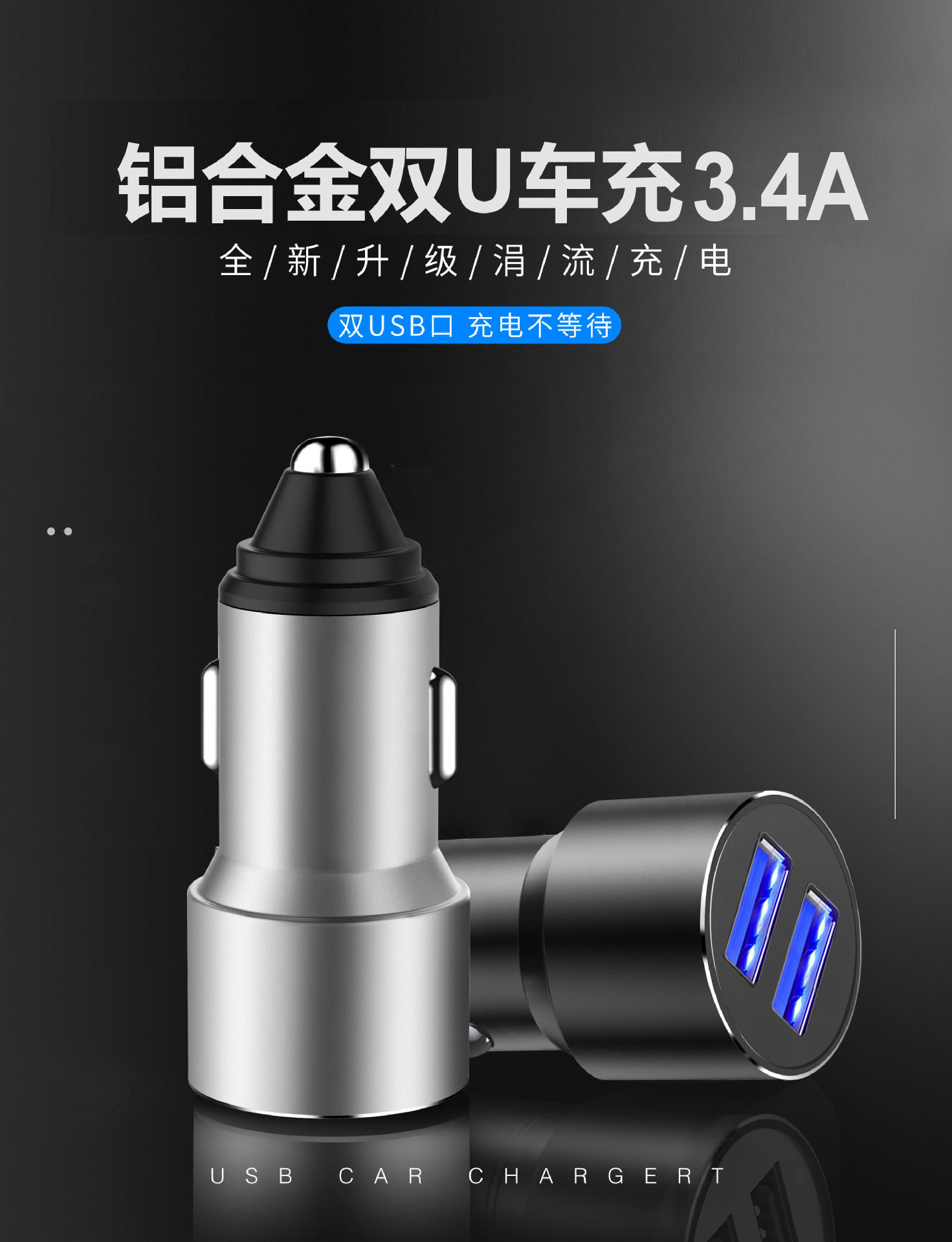 One-to-two car charger dual usb aluminum alloy car charger metal 3.4A car smart fast charger mobile phone car charger