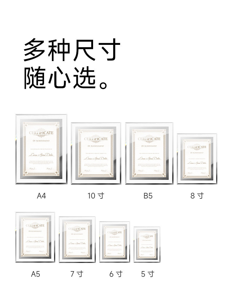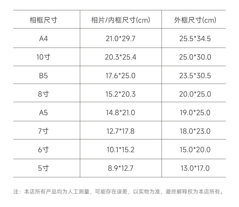 Inner frame size 6inch can be swung horizontally and vertically (inner diameter 10.1*15.2cm),7inch can be swung horizontally and vertically (inner diameter 12.7*17.8cm),8inch can be swung horizontally and vertically (inner diameter 15.2*20.3cm),10inch can be hung or placed horizontally or vertically (inner diameter 20.3*25.4cm),A 5inch can be swung horizontally and vertically (inner diameter 14.8*21cm),B 5inch can be swung horizontally and vertically (inner diameter 17.6*25cm),A 4inch can be hung or placed horizontally or vertically (inner diameter 21*29.7cm)