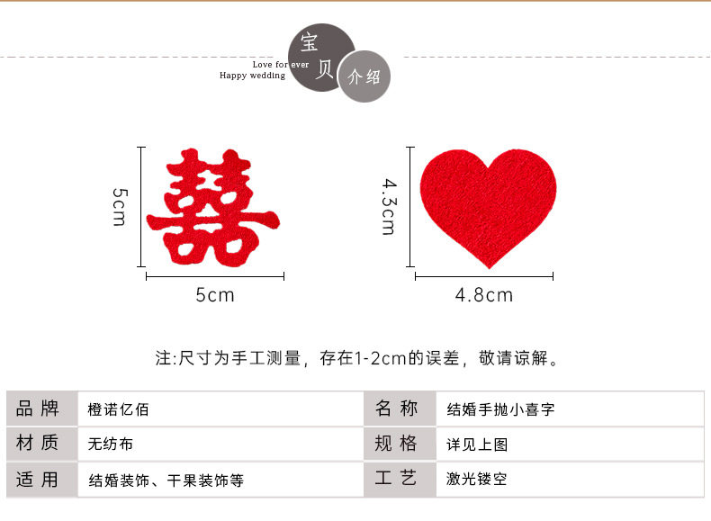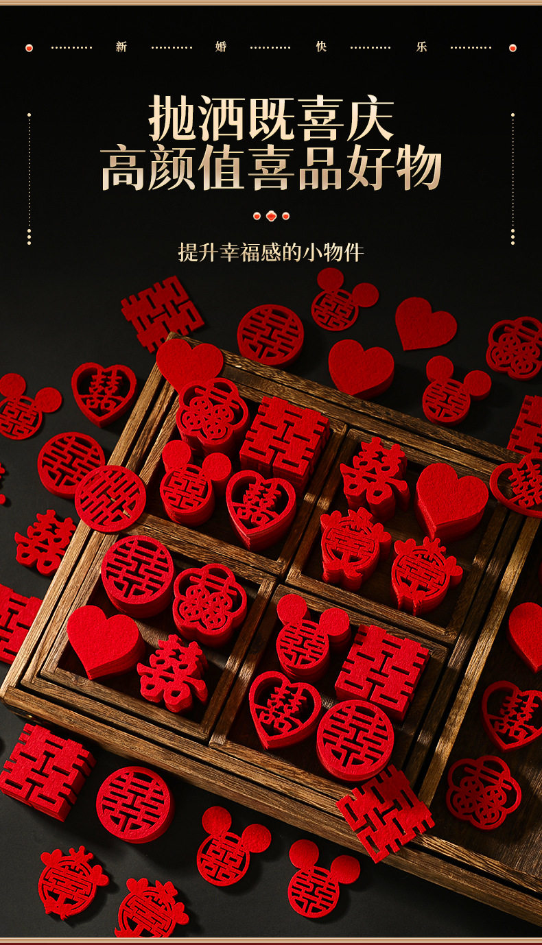 | Specifications | Hand-thrown happy word_fangxi (pack of 30),Hand-thrown with happy characters_love happiness (pack of 30),Hand-thrown with happy characters_mickeyxi (pack of 30),Hand-thrown happy word_yuan double happiness (pack of 30),Hand-thrown happy word_plum blossom happiness (pack of 30),Hand-thrown happy word_classic fangxi (pack of 30) |