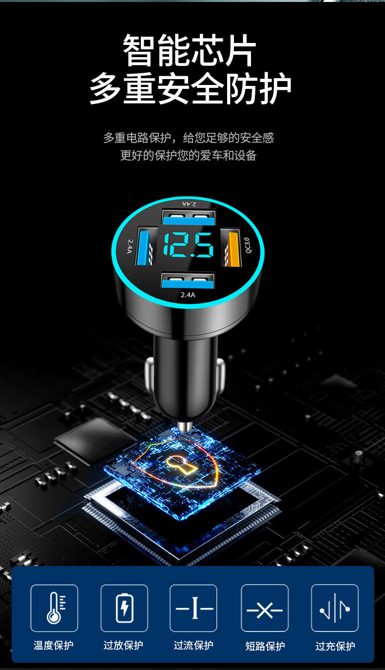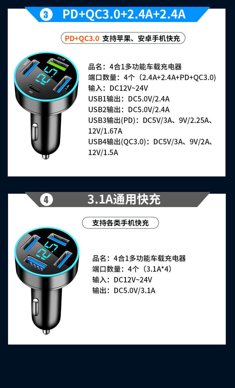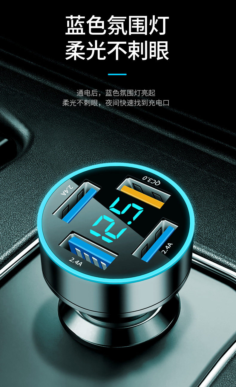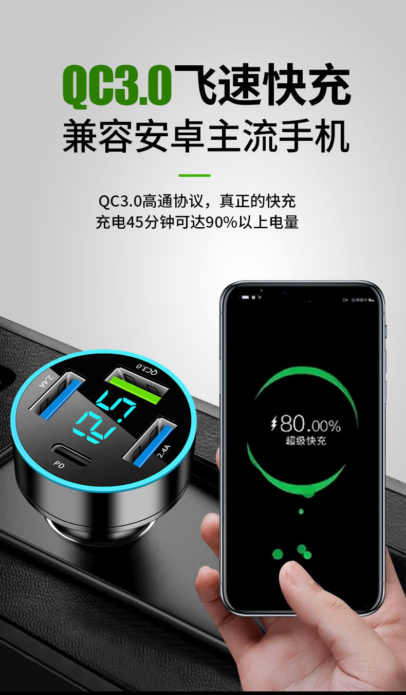 New aluminum ring PD + QC3.0 + 2.4A cross-border four-port car charger 4USB car charger factory direct sales