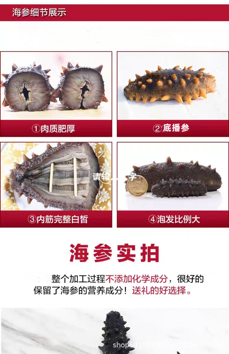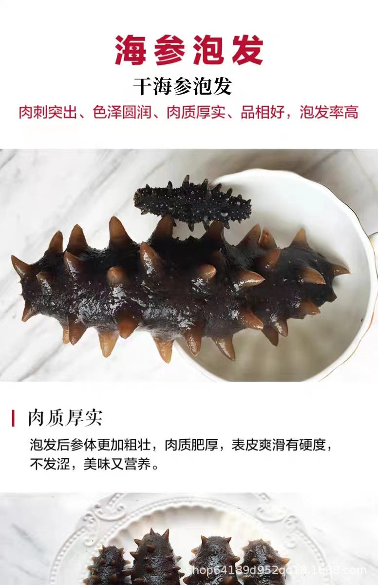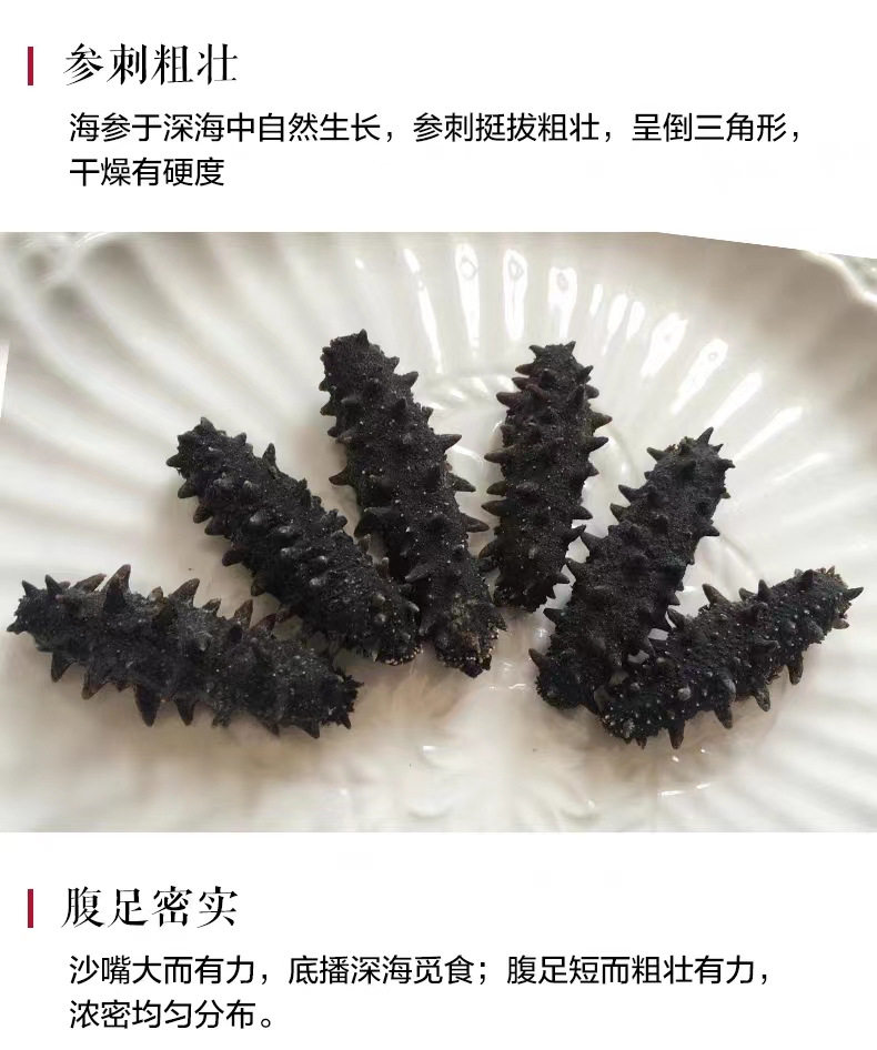 | Packaging specifications | Round bottle gift box [light dry sea cucumber 2-3cm/piece],Round bottle gift box [light dry sea cucumber 3-4cm/piece],Round bottle gift box [light dry sea cucumber 4-5cm/piece],Square bottle gift box [light dry sea cucumber 2-3cm/piece],Square bottle gift box [light dry sea cucumber 3-4cm/piece],Square bottle gift box [light dry sea cucumber 4-5cm/piece],Quick gift box [quick sea cucumber 2-3cm/piece],Quick gift box [quick 3-4cm/piece] |