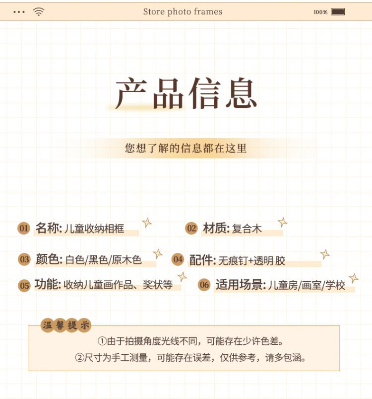 | Inner frame size | Wood color,Wood grain white,Wood grain black,Off white,Dark wood color |
