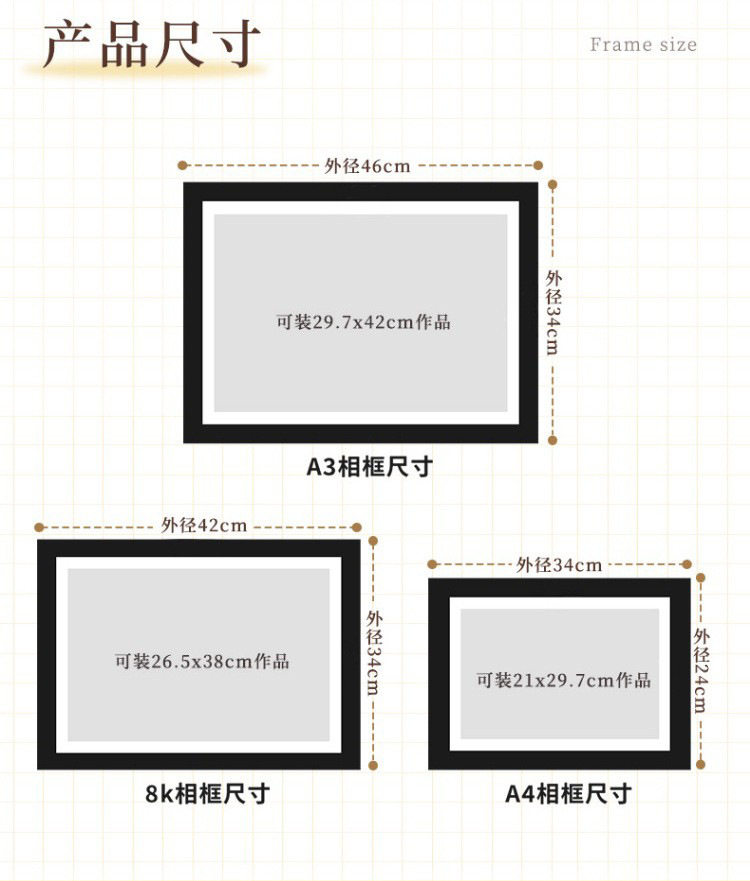 | Frame size | A4 [can hold 21*29.7cm],Put 8inch [with 7inch / 6inch paper jam]; inner diameter 15.2*20.3cm,A3 [can hold 29.7*42cm],8 openings [can hold 26.5*38cm],4 openings [can hold 38*52cm],Square [can hold 25*25cm],Square [can hold 33*33cm],Square [can hold 38*38cm] |
