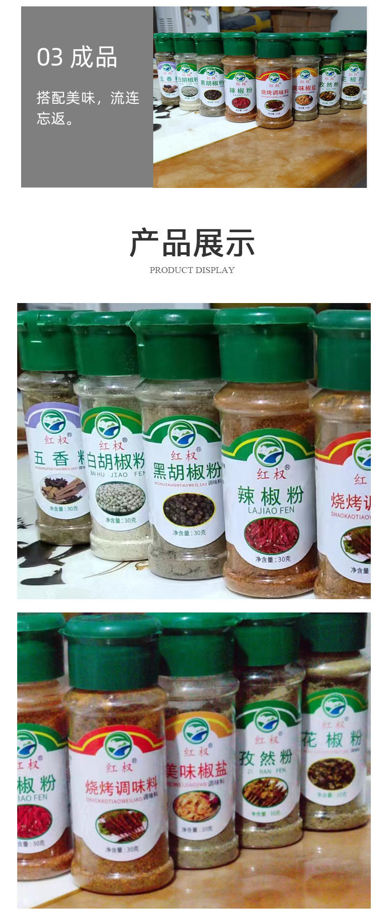 | Packaging specifications | Barbecue seasoning 50 bottles/box,50 bottles/box of cumin powder,50 bottles/box of pepper powder,50 bottles/box of delicious pepper and salt,50 bottles/box of chili powder,50 bottles/box of black pepper,50 bottles/box of white pepper,50 bottles/box of spiced powder,Mixed 50 bottles/box |