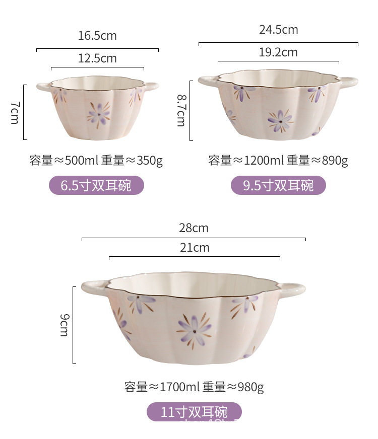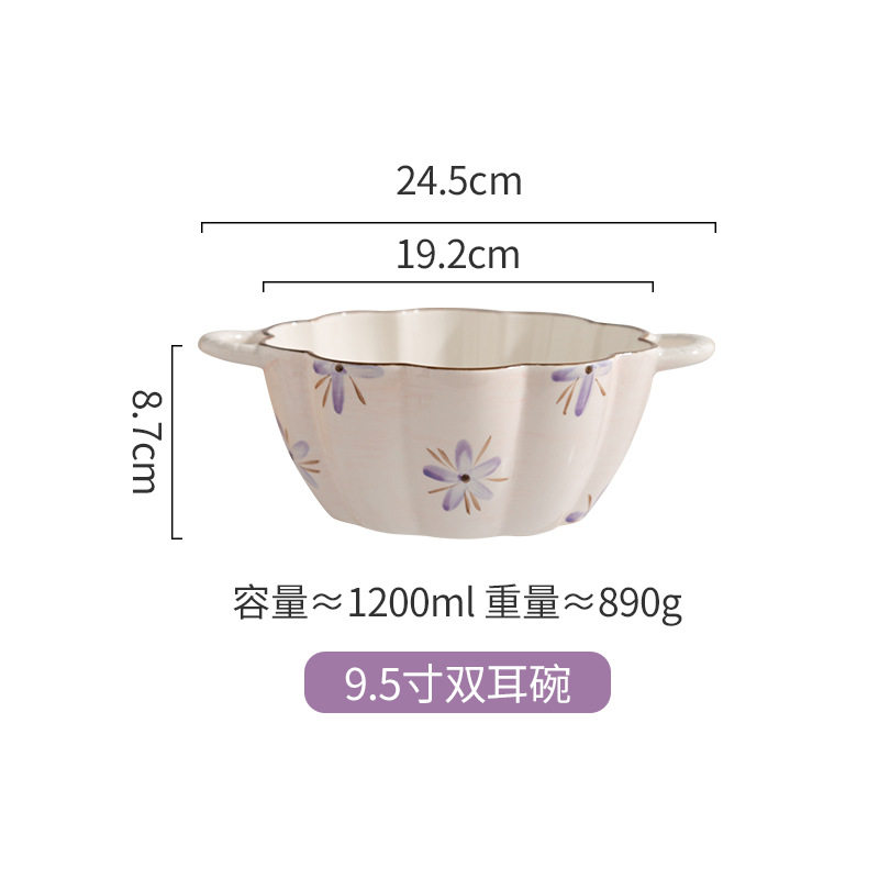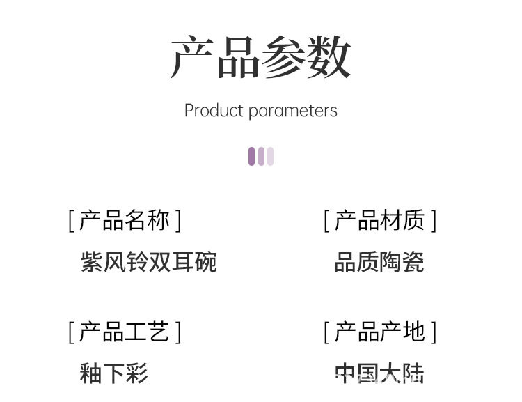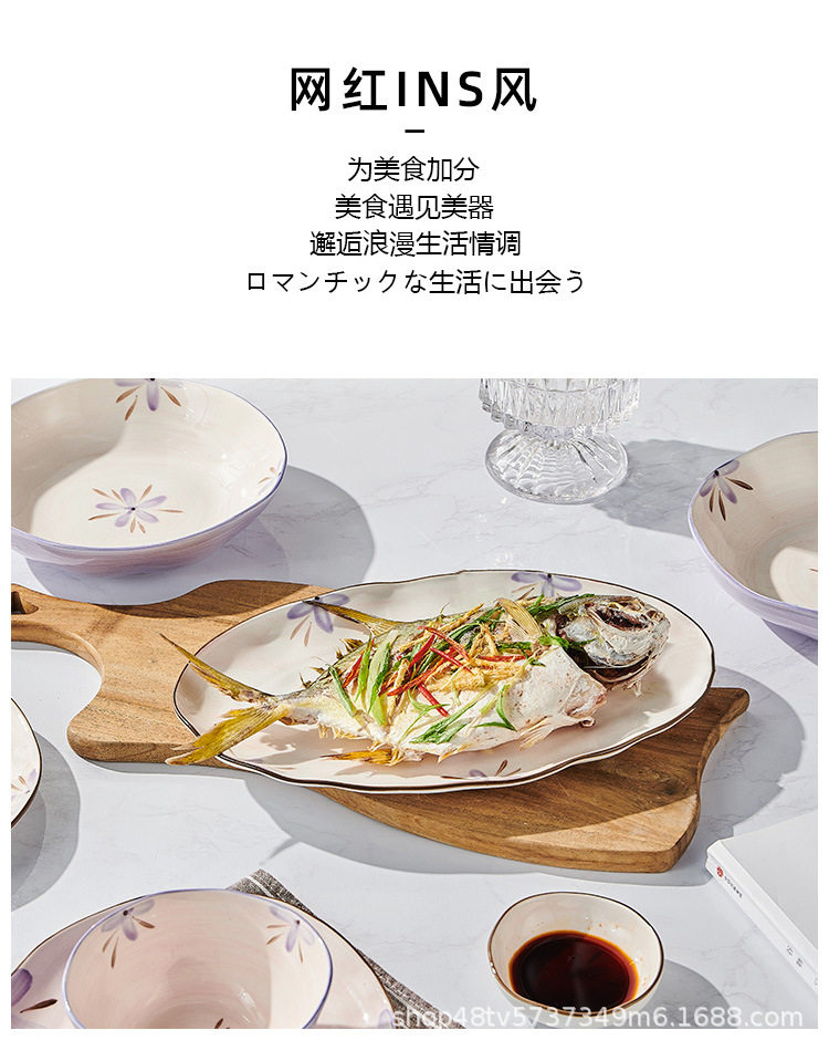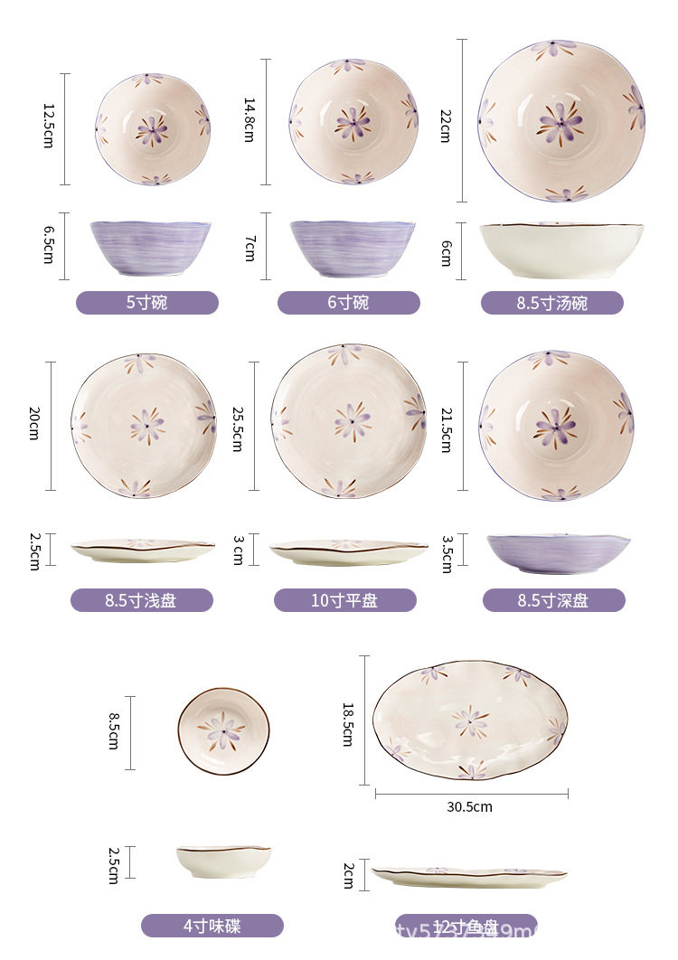 | Specification | 5" special-shaped rice bowl,6" special shaped soup bowl,10" flat plate,8" shaped shallow disc,8" special-shaped deep dish,12" special-shaped fish plate,Flavor plate,Purple bellflower - 6.5inch double ear soup bowl,Purple bellflower - 9.5inch double ear soup bowl,Purple bellflower - 11inch double ear soup bowl,Purple bellflower long-handled spoon,Purple bellflower long-handled spoon,8.5inch opposite sex soup bowl |