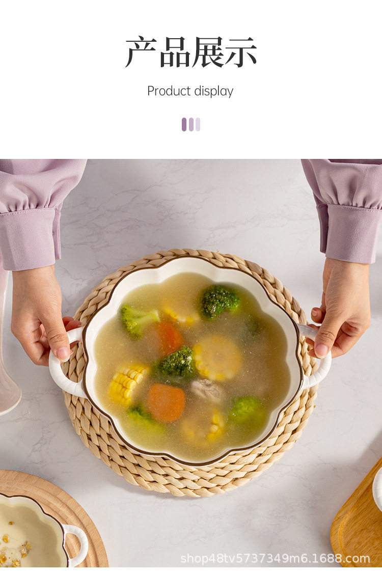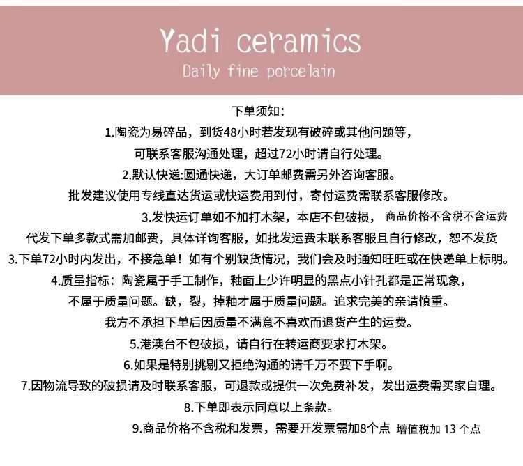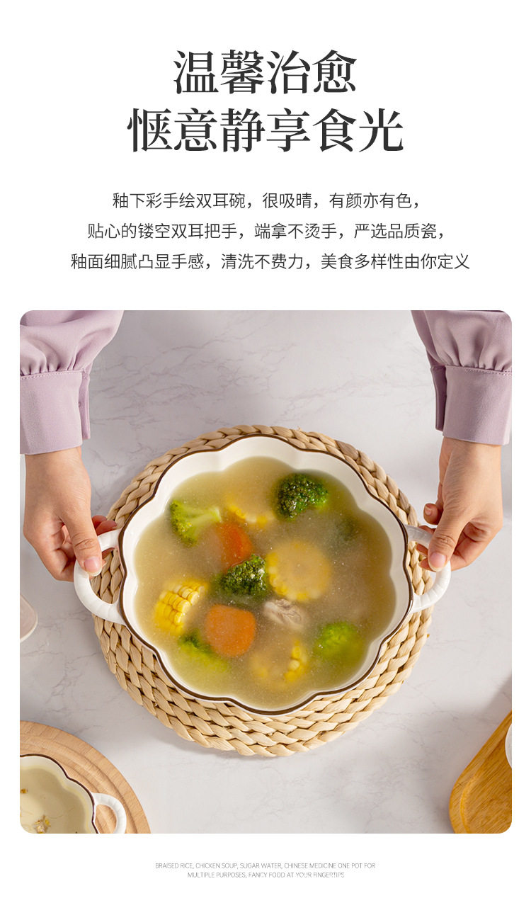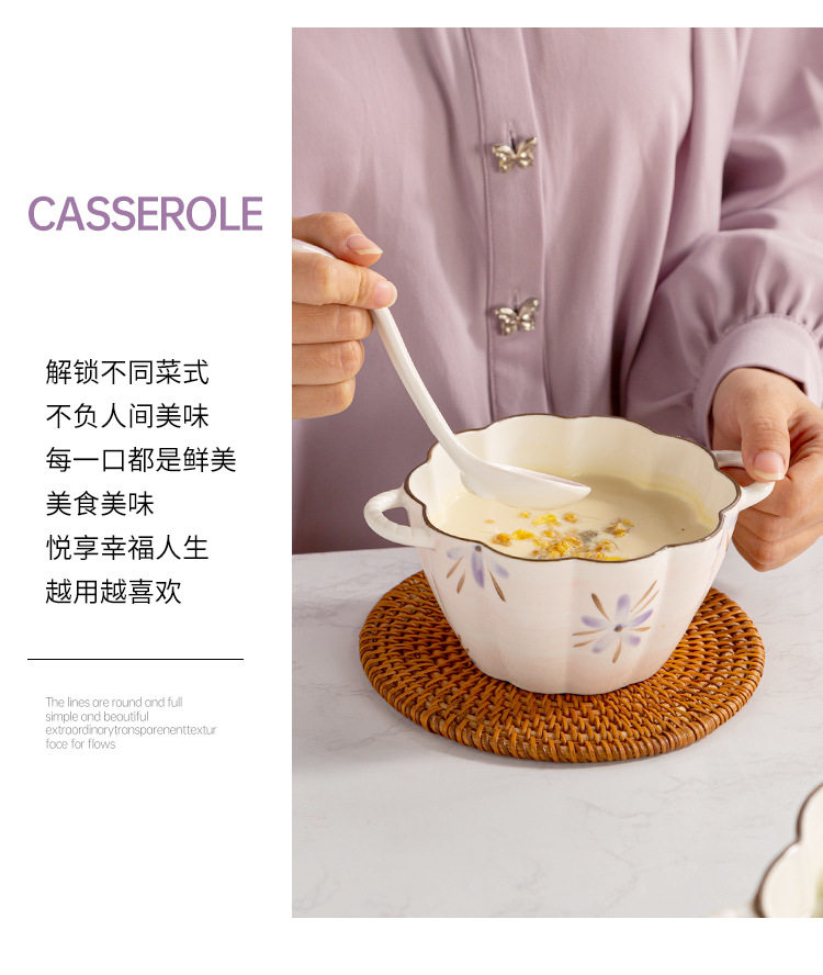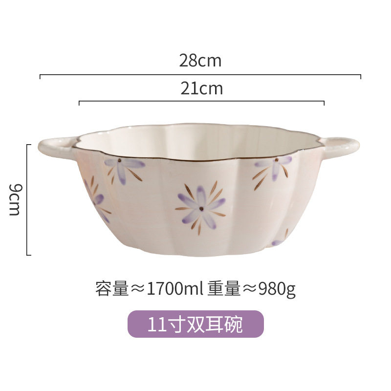| Specification | 5" special-shaped rice bowl,6" special shaped soup bowl,10" flat plate,8" shaped shallow disc,8" special-shaped deep dish,12" special-shaped fish plate,Flavor plate,Purple bellflower - 6.5inch double ear soup bowl,Purple bellflower - 9.5inch double ear soup bowl,Purple bellflower - 11inch double ear soup bowl,Purple bellflower long-handled spoon,Purple bellflower long-handled spoon,8.5inch opposite sex soup bowl |